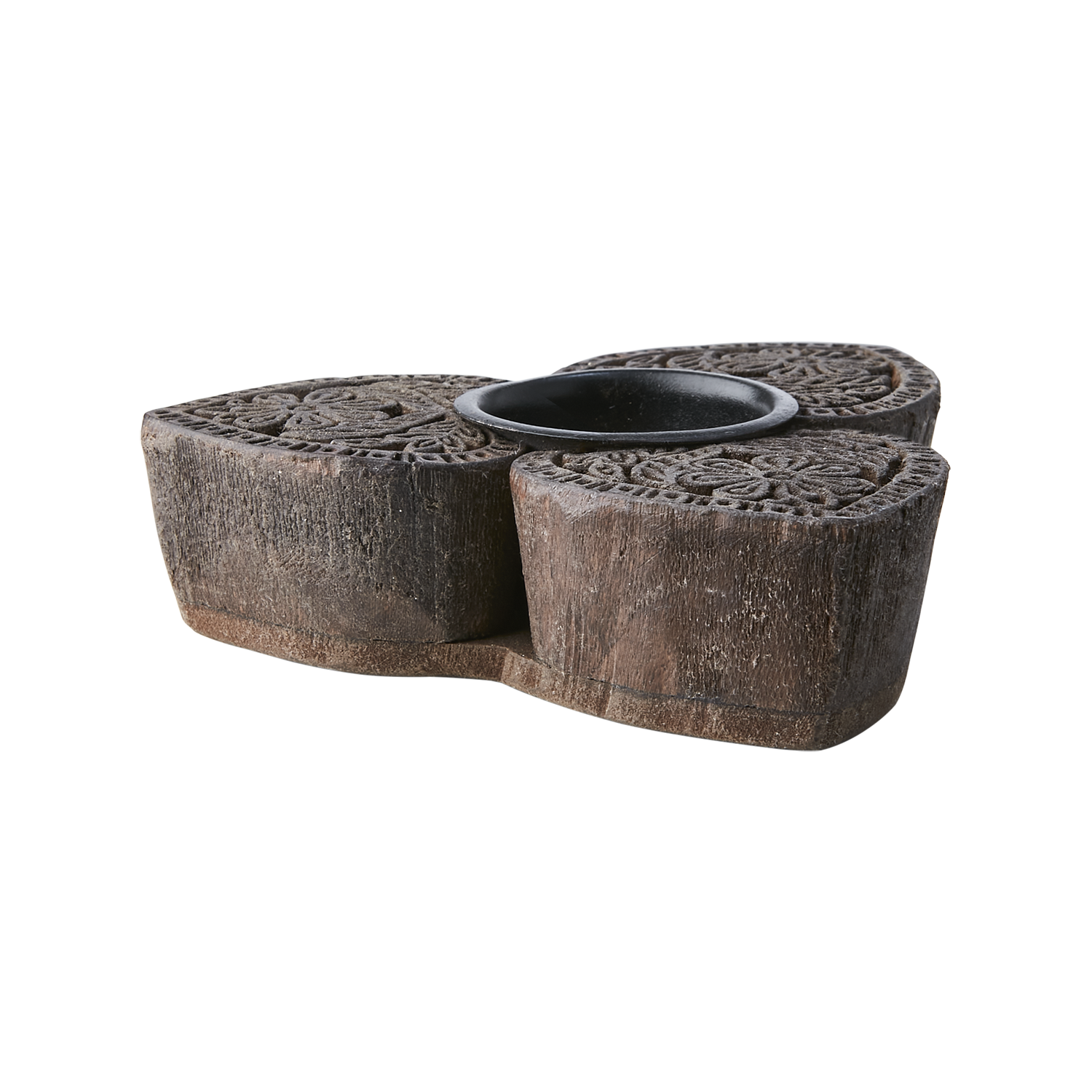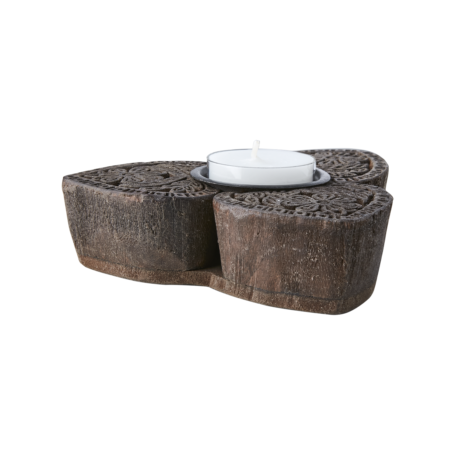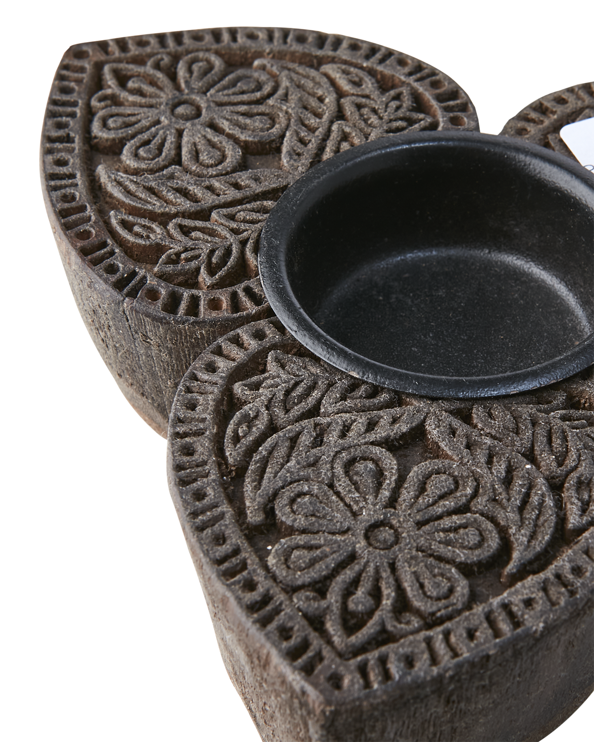 En dekorativ telysholder i tre. Bladformede elementer som omkranser telyset. Hvert blad har intrikate mønster ig utskjæringer som gir et håndlaget og etnisk preg.