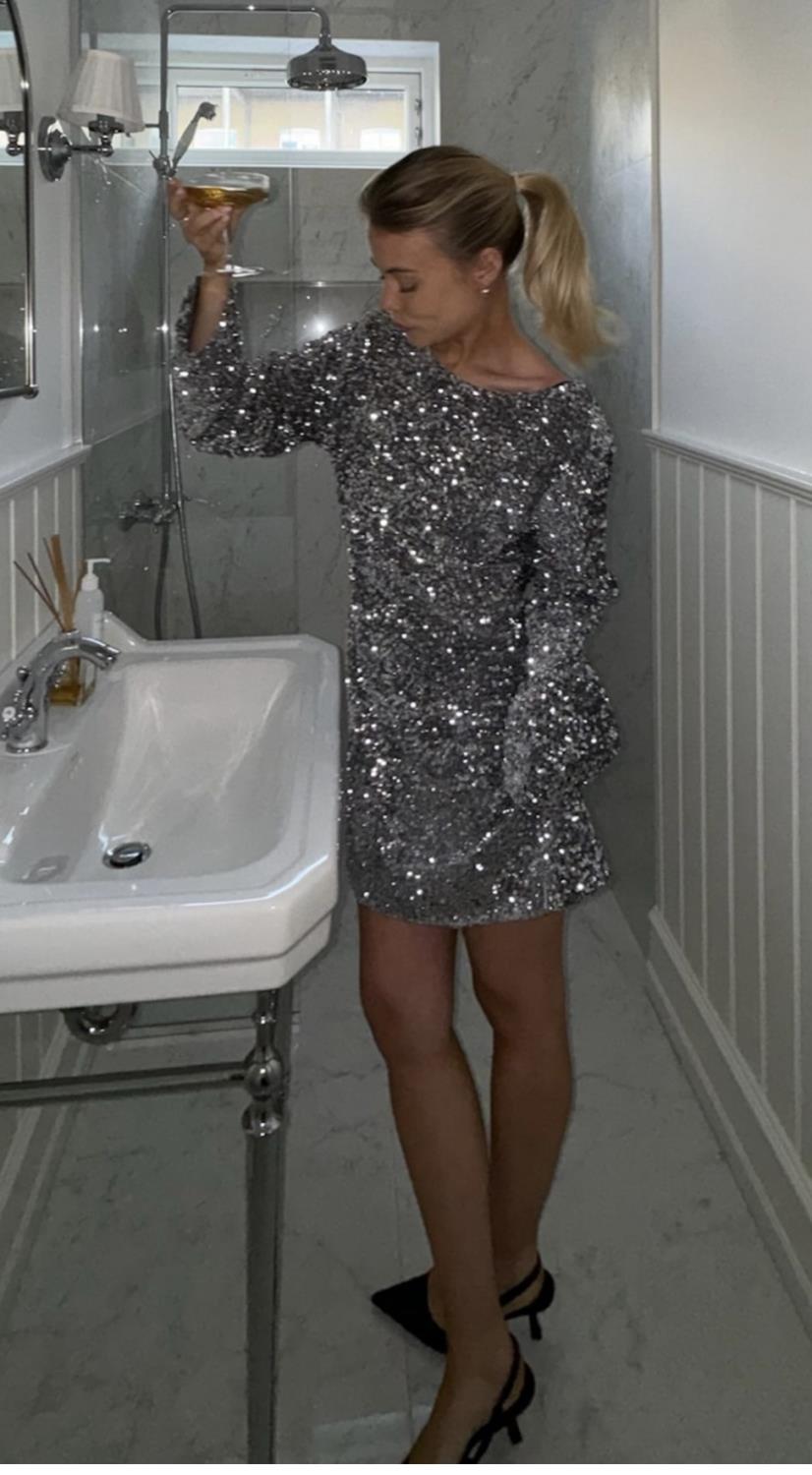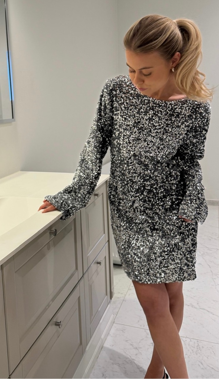 Nydelig paljettkjole fra BY IC. Bella Sequin Dress har lange armer og en sort sløyfe i ryggen. Kjolen er en minikjole. Usynlig glidelås bak. God fasong med litt vidde.