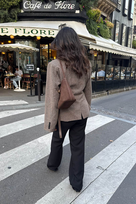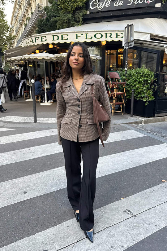 En brunrutete blazer i et vakker, kraftig stoff. Blazeren er skreddersydd for en flatterende passform og har lange, rette ermer. Den har to lommer foran og en skjortekrage som åpnes i en v-form foran. Lukkes med mørke, naturfargede knapper. Splitt bak, som gir et elegant preg.