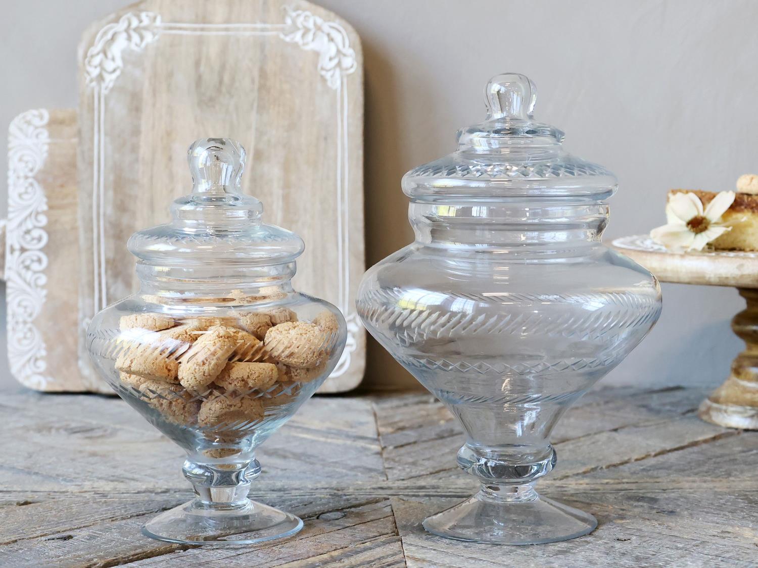 Glasskrukke på fot, med lokk, fra Chic Antique.