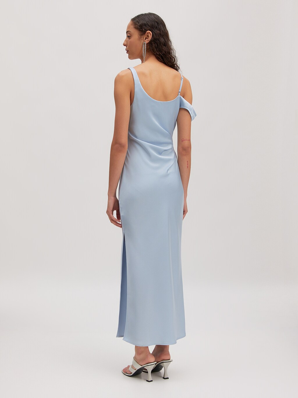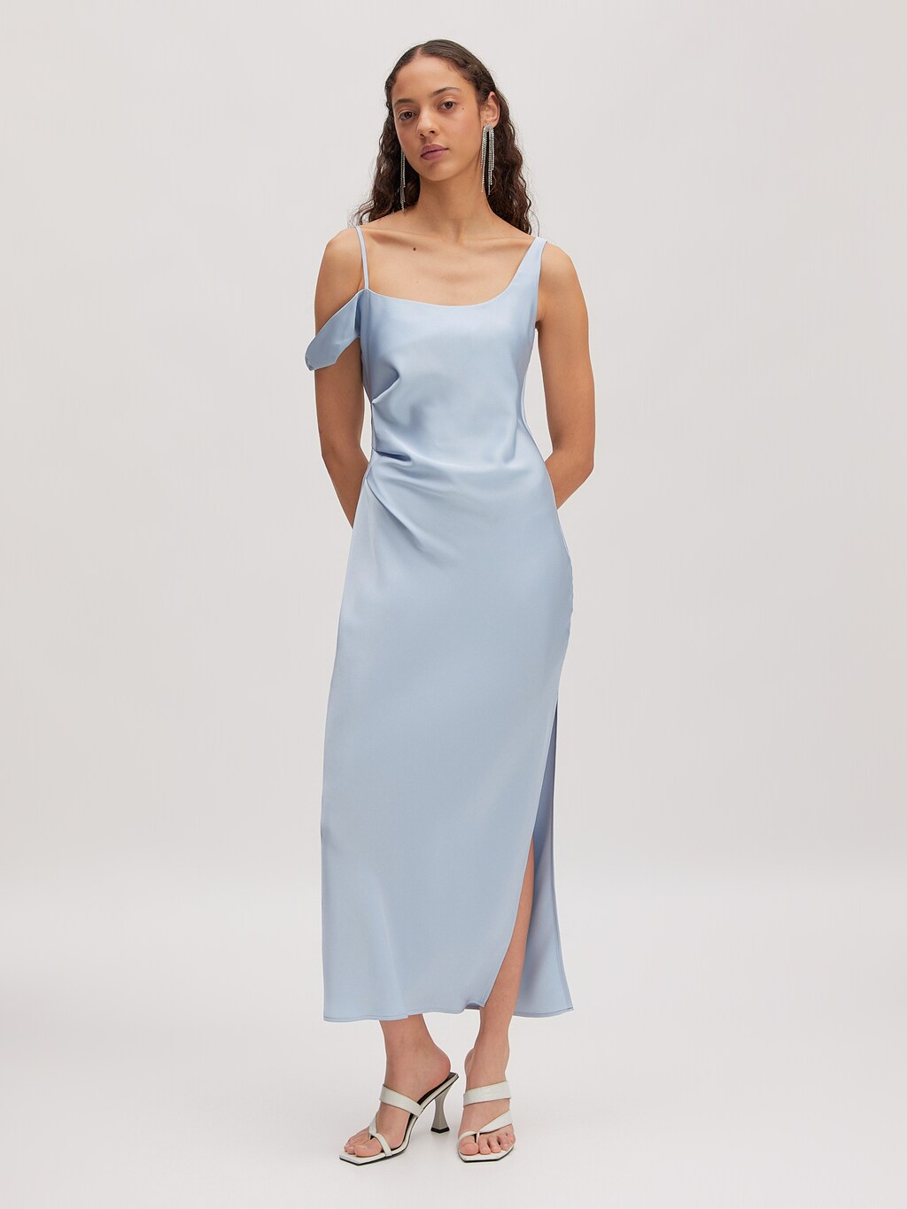 Valeska dress fra EDITED er en elegant og minimalistisk midi kjole med et moderne uttrykk. Kjolen har en asymmetrisk utringning med en skulderstopp og en off-shoulder detalj som gir et stilrent, men spennende design. Den figurnøre passformen fremhever silhuetten på en flatterende måte, mens en disket splitt i siden søger for god bevegelse og et sofistikert preg.