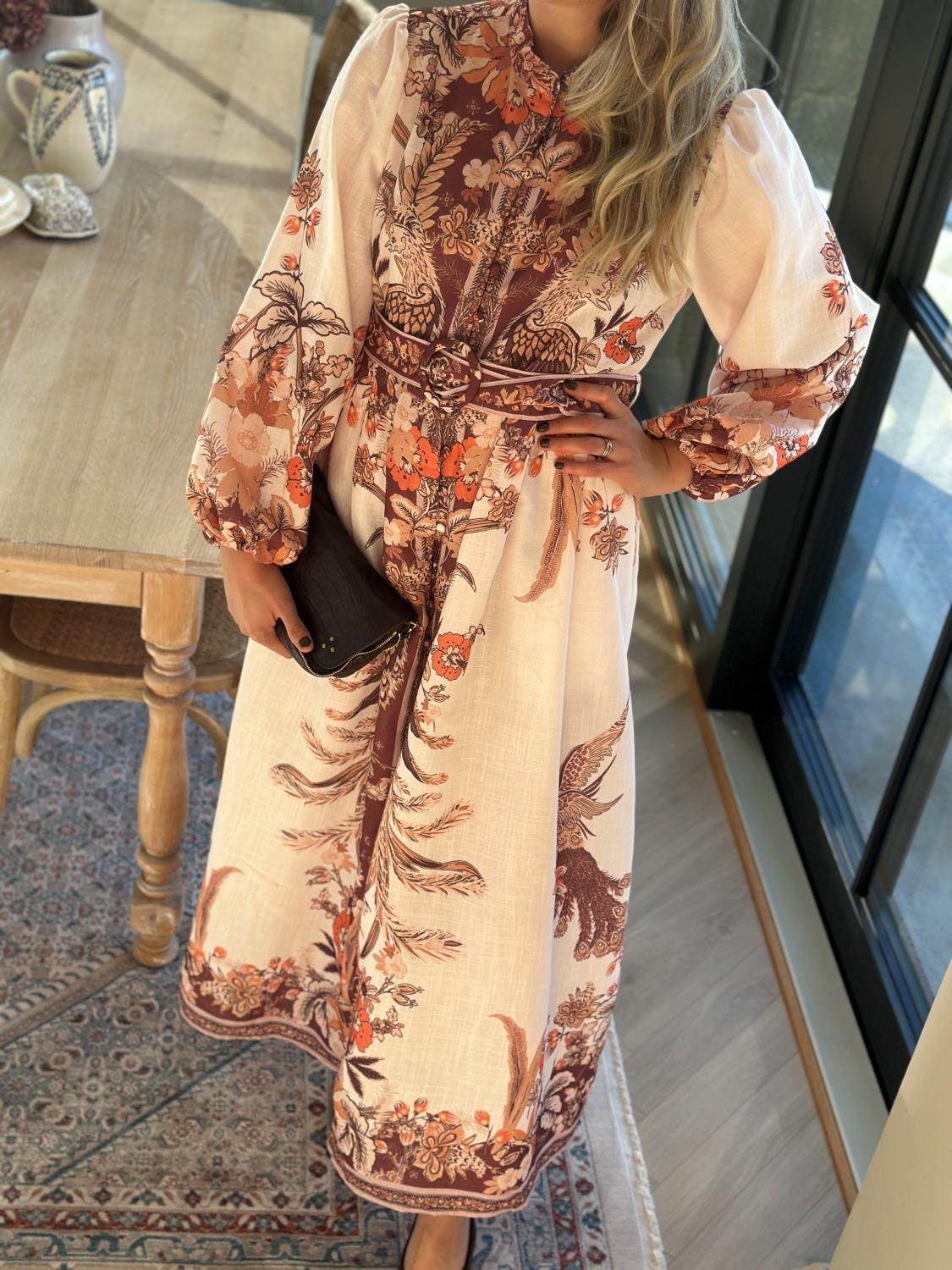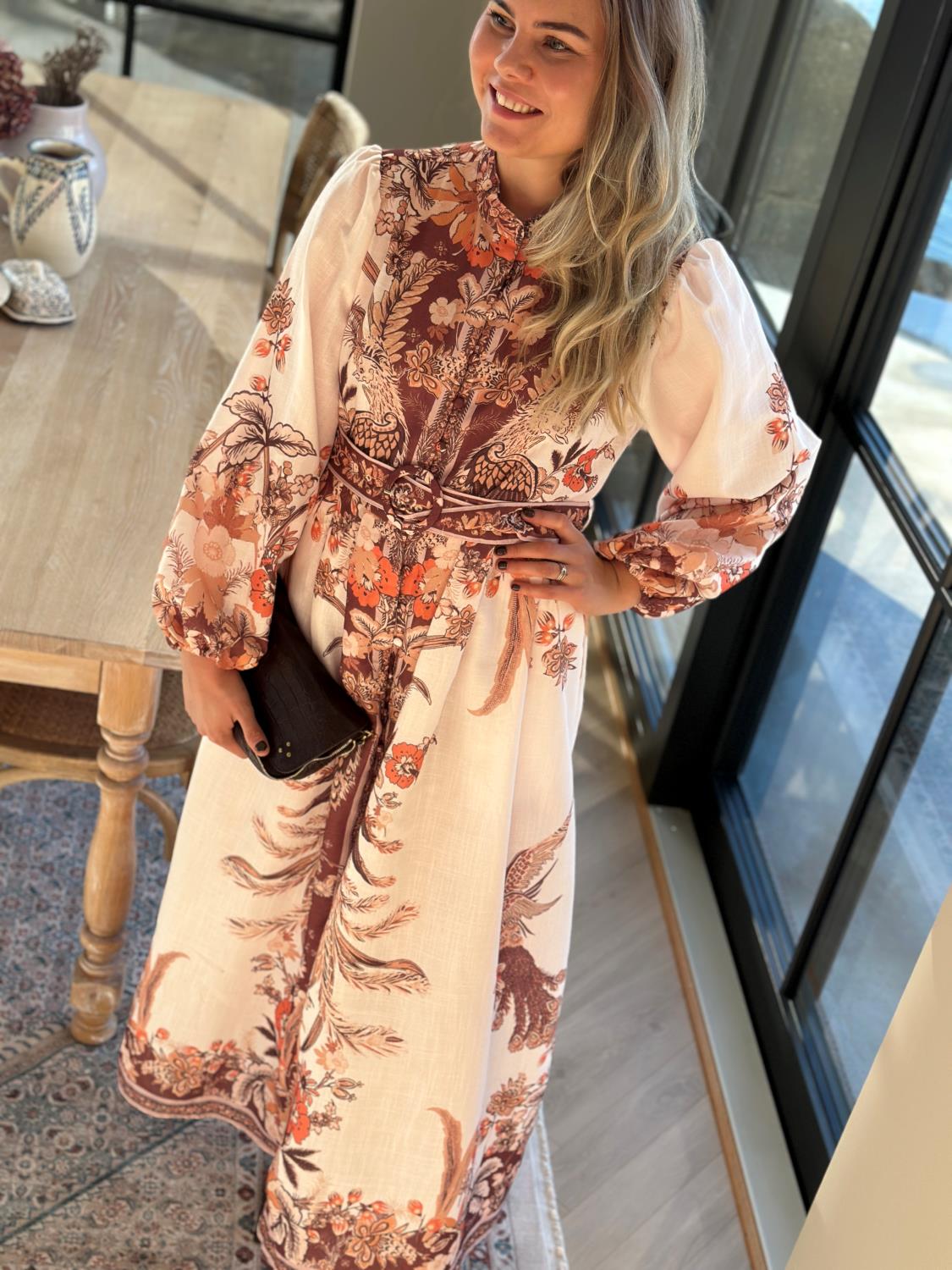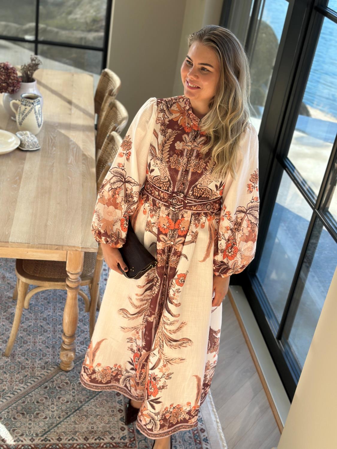Nok en nydelig kjole fra From Paris With Love med et fantastisk print. Kjolen går i beige, brune og orange toner, har knappelukking hele veien i front, samt tilhørende belte.