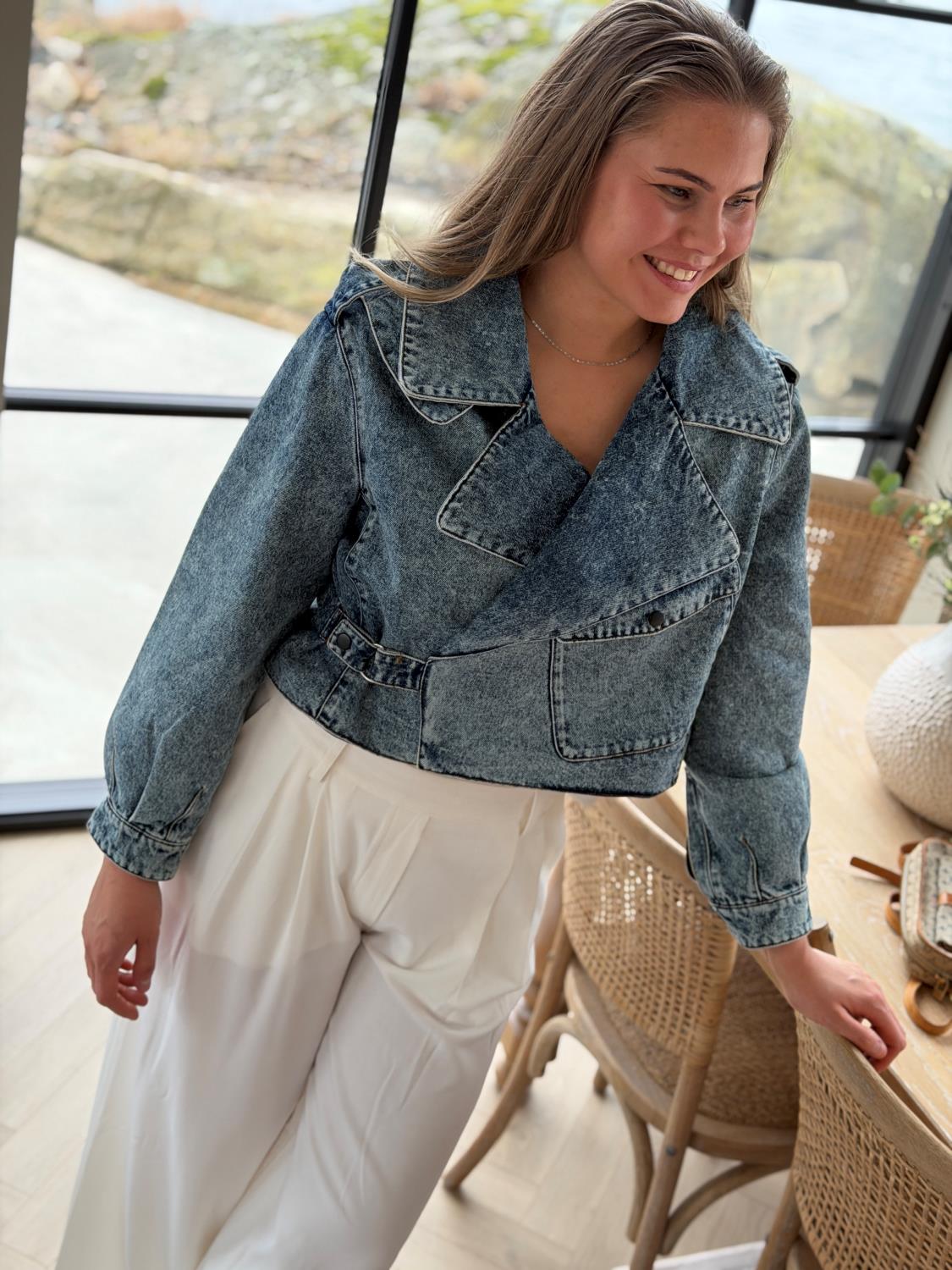 Aurora Jeans Jacket har en kort og lett boxy passform med markert krage og dekorative slag som gir et sofistikert og moteriktig preg. De vide ermene med mansjetter og knappedetaljer skaper en balansert silhuett, mens de gjennomtenkte lommene og detaljene foran gir jakken karakter. Jakken er cropped, noe som gjør den perfekt å kombinere med kjoler, skjørt og høytlivsbukser, og gir et flatterende snitt som fremhever midjen.
