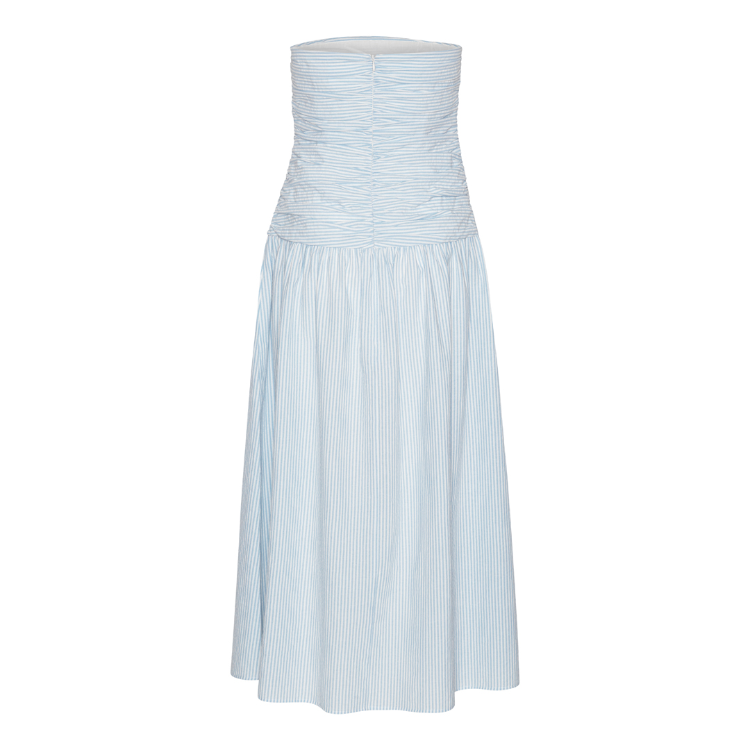 Mya Tube Dress fra Helene Studios er en feminin og tidløs sommerkjole. Kjoler han smale striper i hvitt og lyseblått – perfekt denne sesongen.
