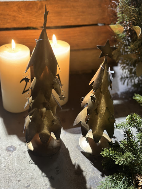 Nydelig juletre i “gull” med små hengende stjerner. Perfekt til og dekke bord eller bare pynte med på et salongbord, på en hylle eller en vinduskarm. H 25 cm