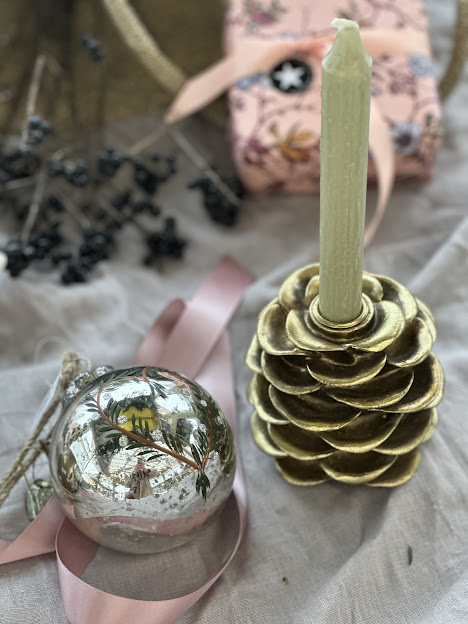 Nydeligf konglesatake i gullfarget metall. Staken er til kronelys.