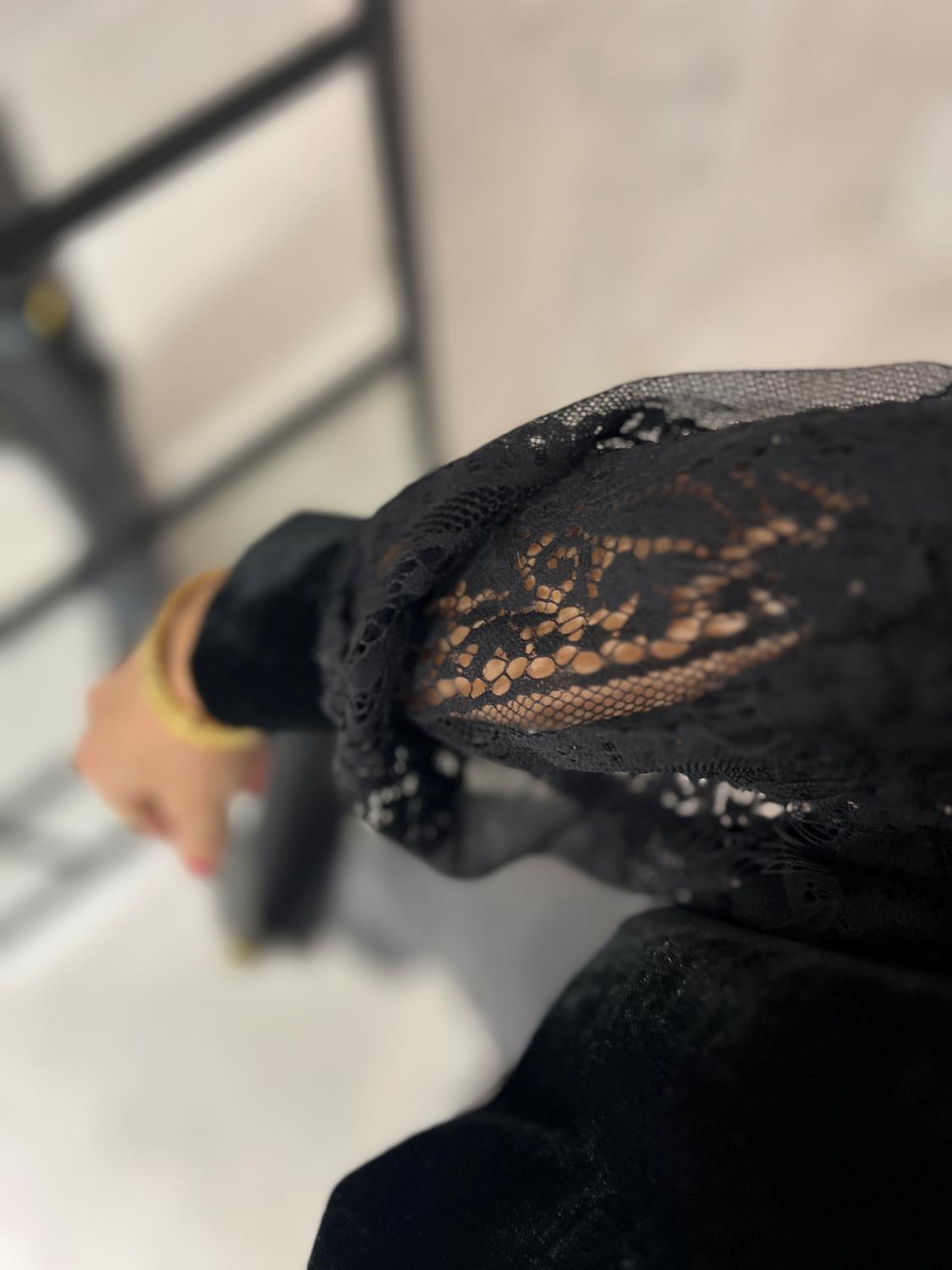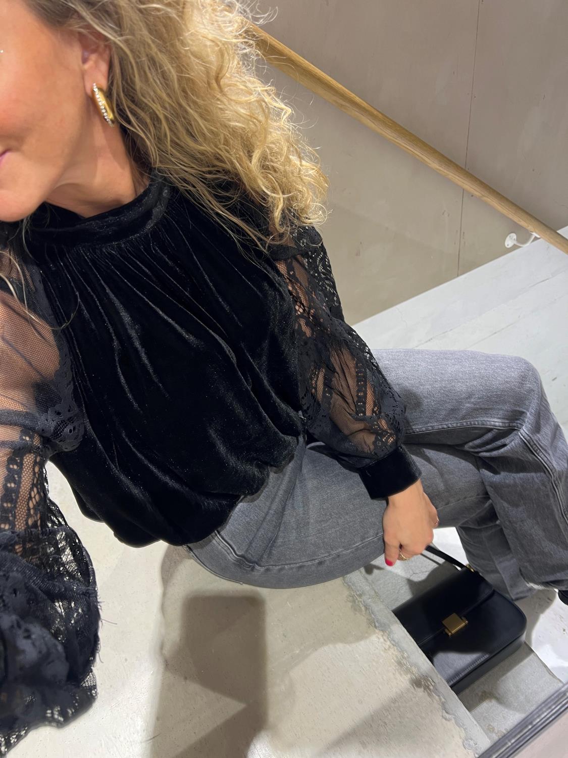 Elegant og feminin bluse fra Le Coco, med en interessant kombinasjon fløyel og blonder. Den har høy hals, løs fasong med strikk i bunnen.