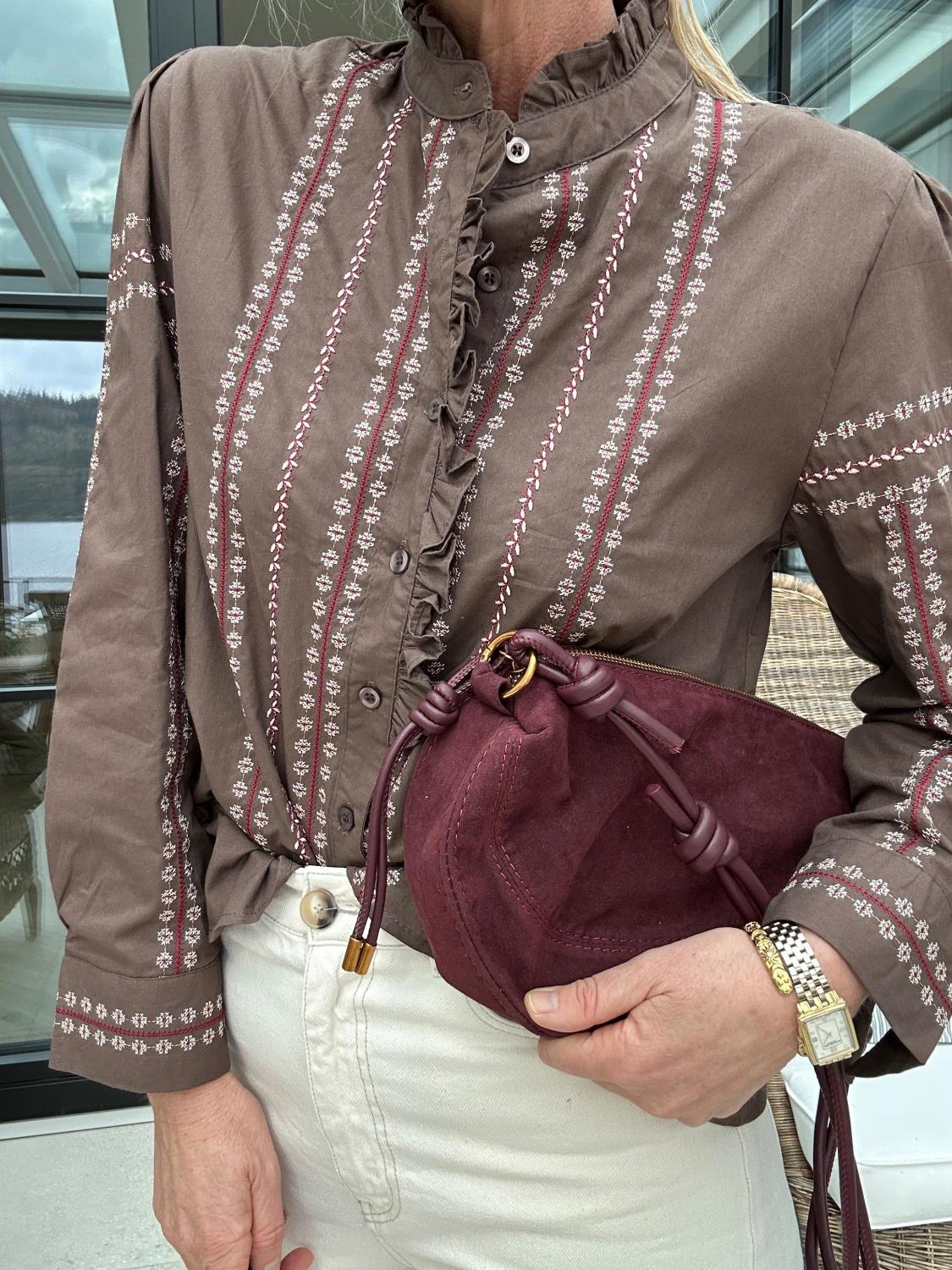 Nydelig brun bluse med broderier i rødt og hvitt. Feminin og søt krage. Knappelukking i front.