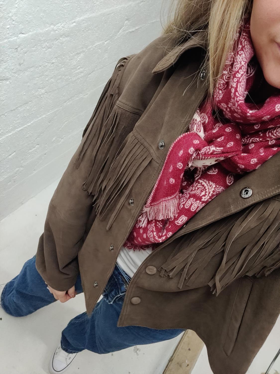 Stort trekant-skjerf i rødt og hvitt. Fint i halsen eller rundt skuldrene. Kan brukes begge veier.