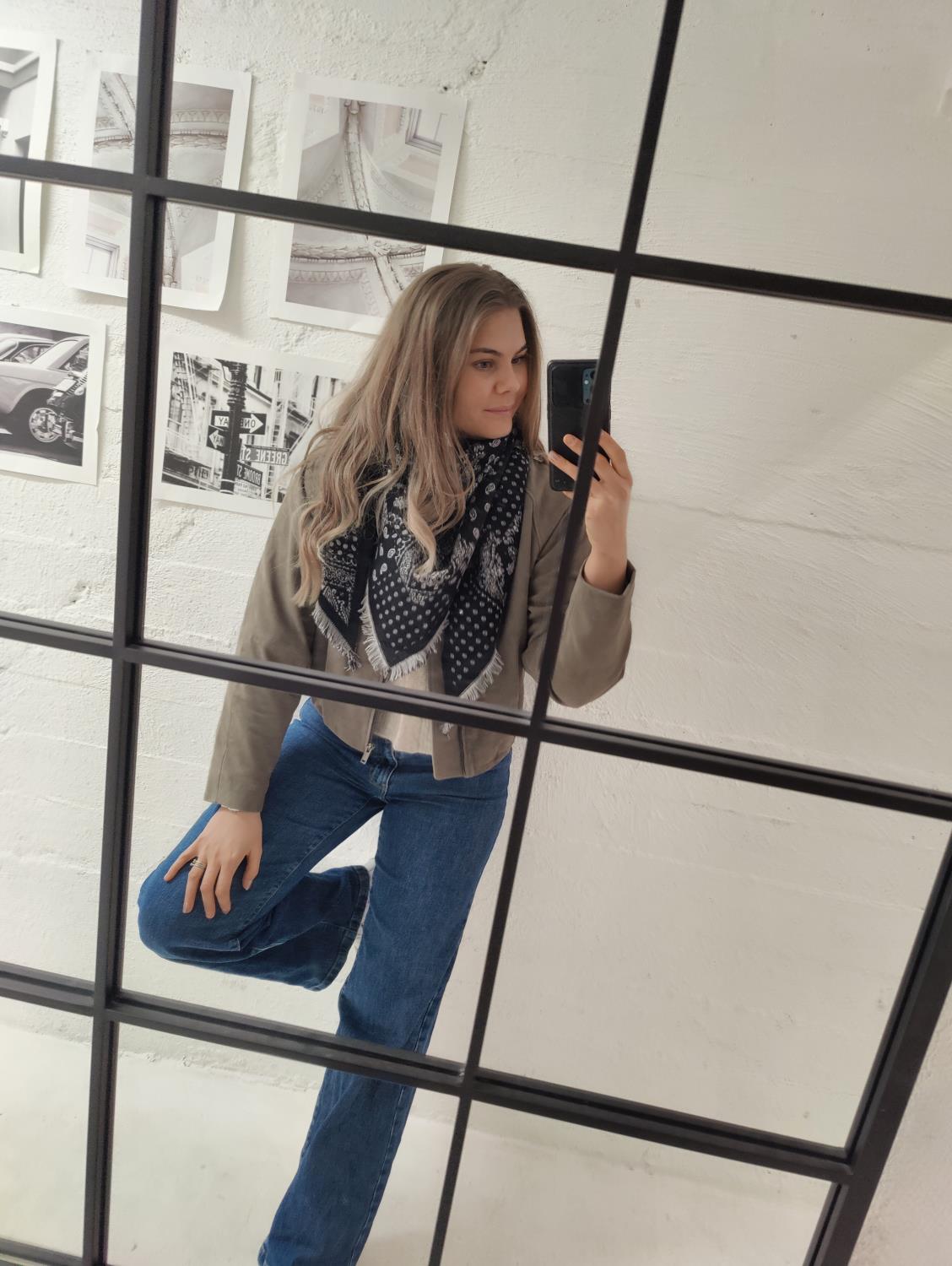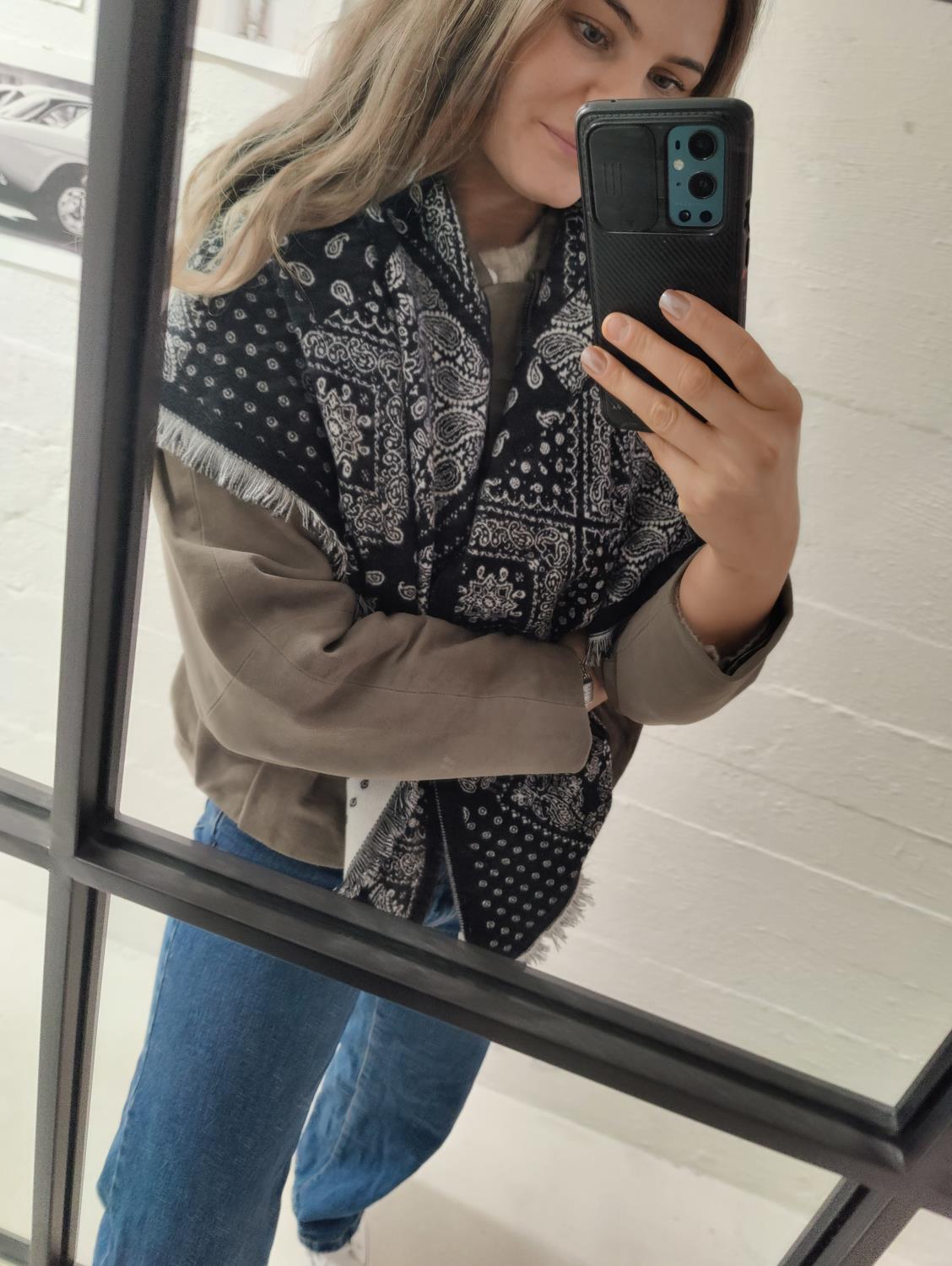Stort trekant-skjerf i sort og hvitt. Fint i halsen eller rundt skuldrene. Kan brukes begge veier.