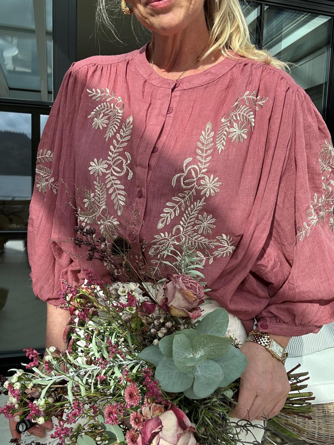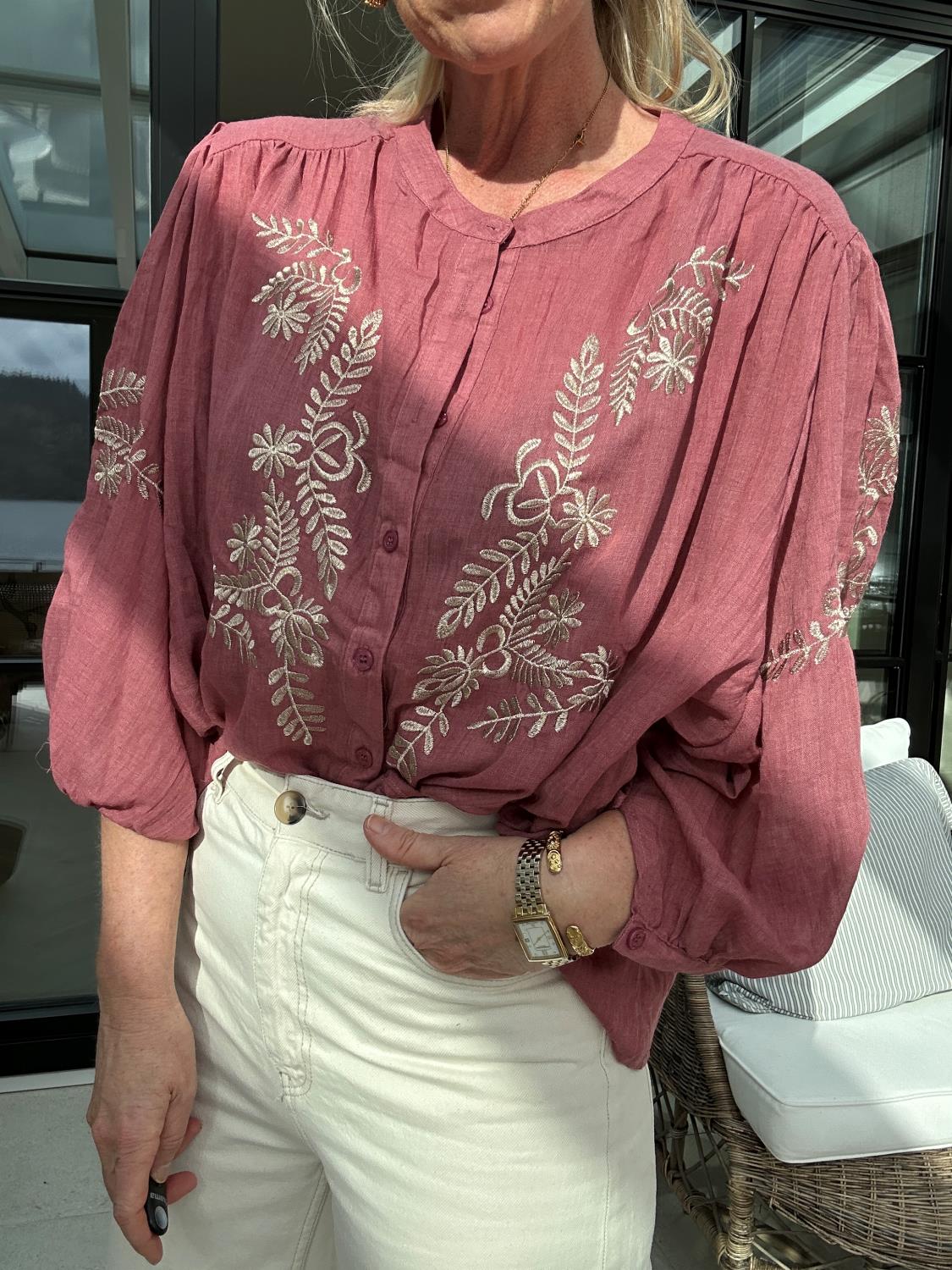 En lett og luftig bluse i en deilig bringebærfarge, med metallisk broderi. 3/4 dels armer. God i størrelsen!