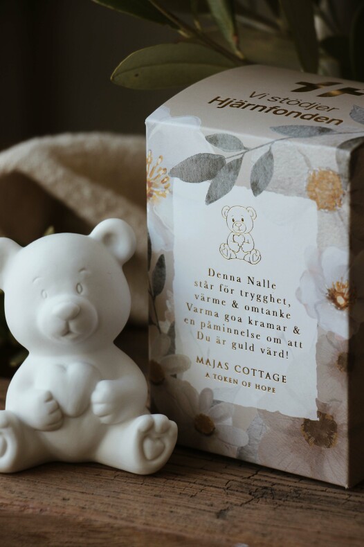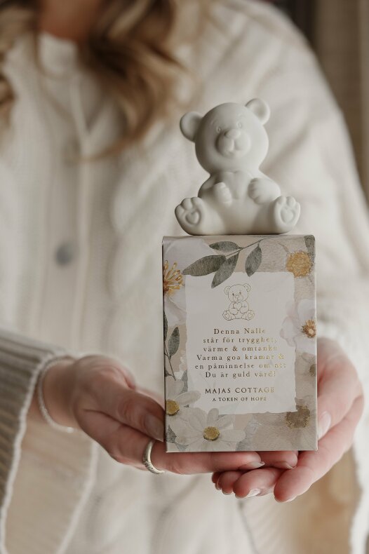 Tekst: Denne teddybjørnen står for trygghet, varme og omsorg. Varme klemmer og en påminnelse om at du virkelig er dyrebar! / This Teddy Bear stands for comfort, warmth & care. Soft warm klemmer & a reminder that you are truly precious.