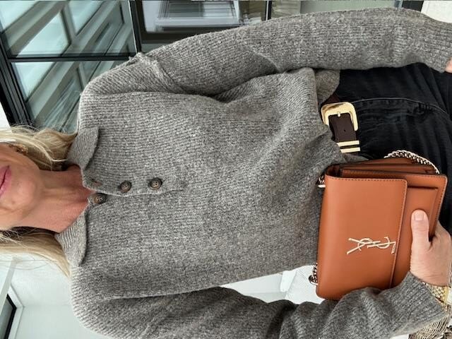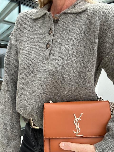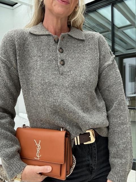 Denne strikkede genseren for dame har en avslappet passform, klassisk polokrage og ribbestrikkede detaljer. Knapper og droppede skuldre gir komfort og stil til hverdagsbruk.
