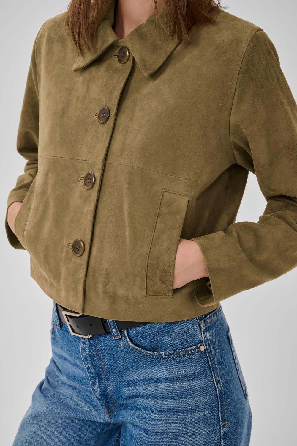 Petra Suede jacket fra My Essential Wardrobe har en kort og avslappet passform, klassisk krage og knappelukking. Perfekt for lag-på-lag og varierte anledninger. Kommer i en stilig grønnfarge som er like fin til hvite jeans på våren eller mørke jeans på høsten.
