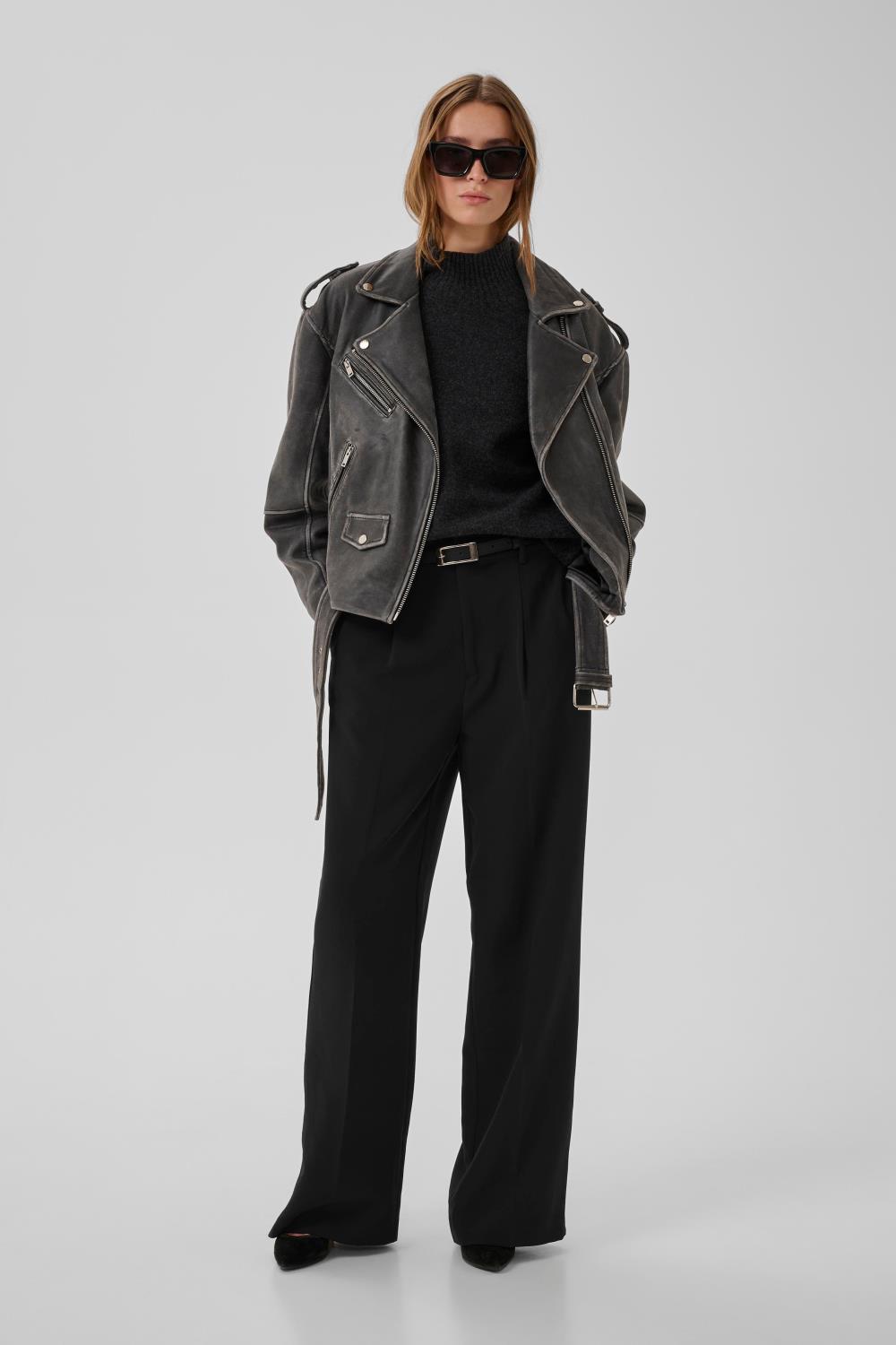 Vide bukser med høy midje, markerte pressefolder og strukturert passform. Beltehemper og rene linjer gir et stilrent, moderne uttrykk.