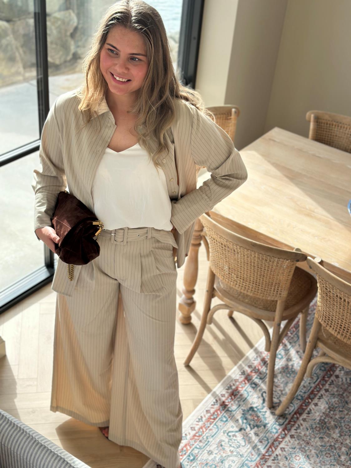 Vitta Shirt fra My Essential Wardrobe er en tøff skjorte i myk og lett kvalitet i beige farge med sorte pinstripes. Skjorten har oversized fasong og klassisk krage med knepping foran. Brede mansjetter og buede splitter i sidene.