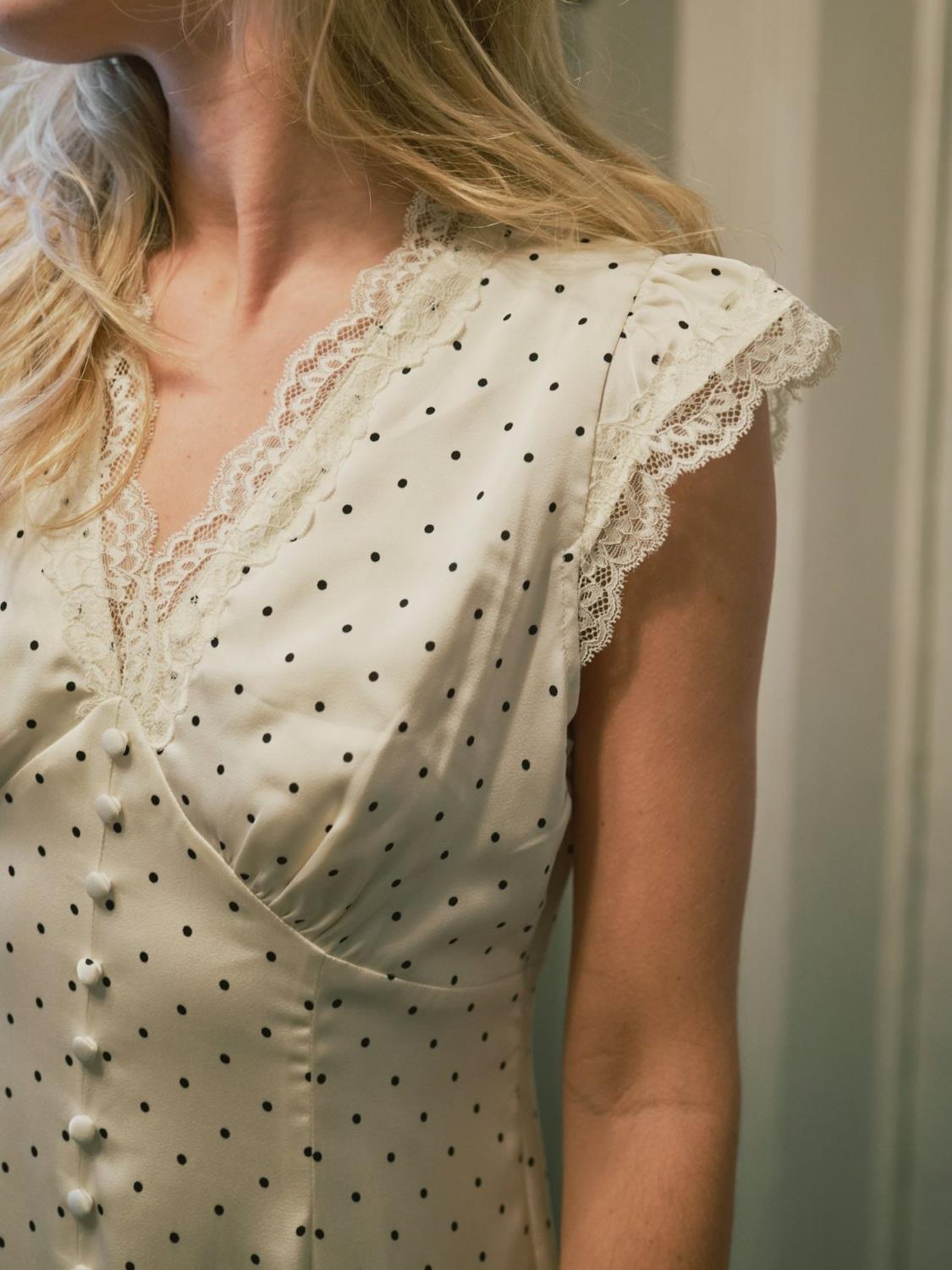Kjole fra Neo Noir i kremfarget med små svarte prikker. Kjolen er laget av 100 % polyester og har blondekant ved V-utringningen og på ermene.