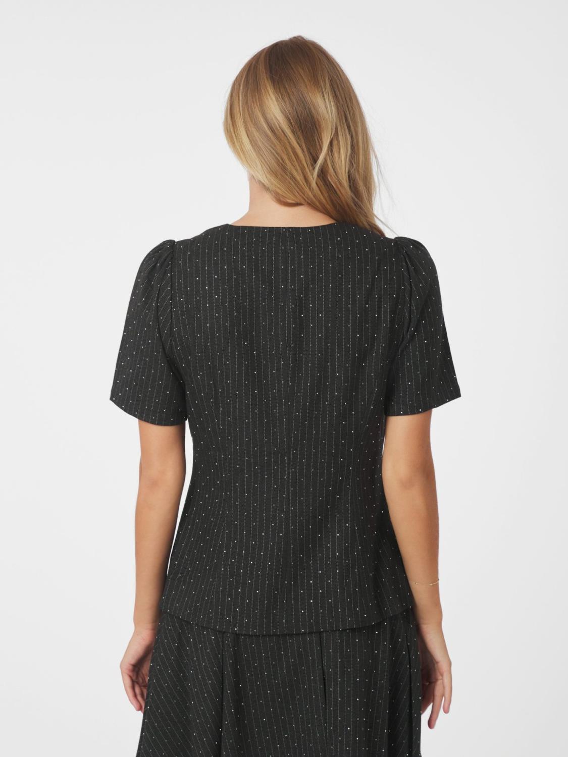 Søt skreddersydd bluse med ekstra lengde, knapper foran og korte ermer. Blusen har rhinestones over hele. Modellen er 176 cm høy og bruker størrelse 36.