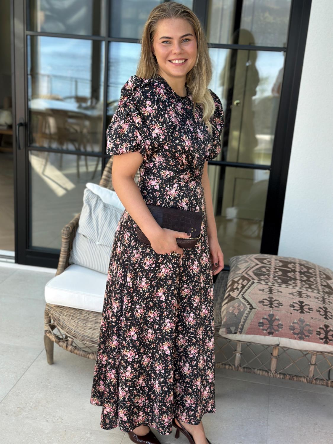 Midi-kjole med et vakkert roseprint fra Neo Noir. Kjolen har 34-sømmer og smock-detaljer bak på livet. Kjolen har en knappelukking i halsen. Modellen er 176 cm høy og bruker størrelse 36.
