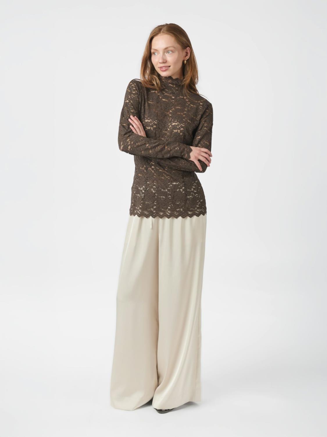 Bluse i stretchblonde med høy hals og knapper bak i nakken. Blusen sitter tett, men er komfortabel i den vakre stretchy blonden. Style den alene eller under en genser eller en blazer.
