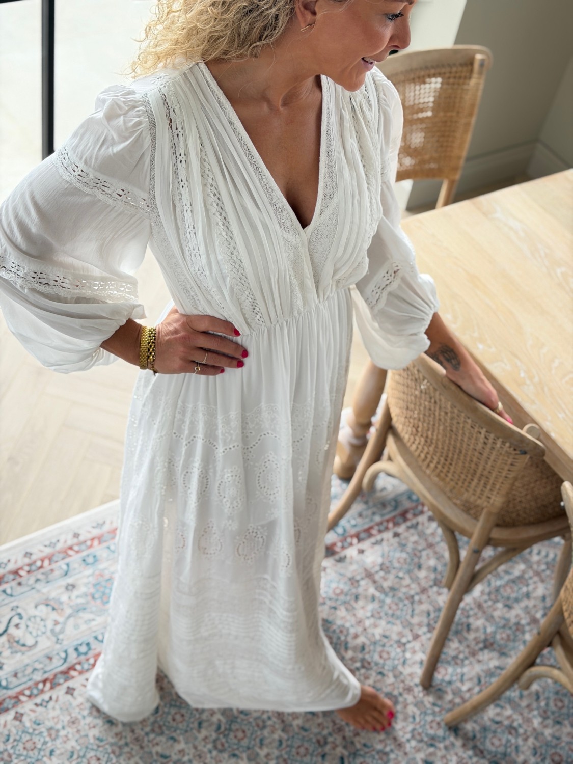 De delikate blondene er nøye utformet med vakre mønstre som gir dybde og struktur til kjolen. Sammen med det medfølgende beltet fremheves midjen på en flatterende måte, og skaper en feminin og balansert silhuett.