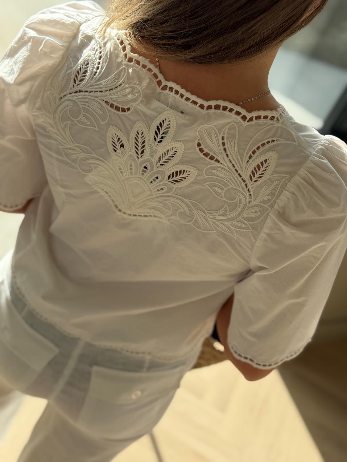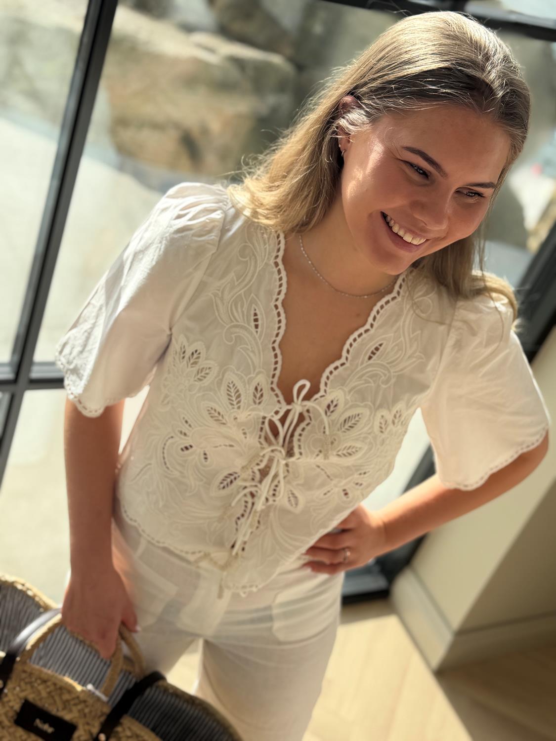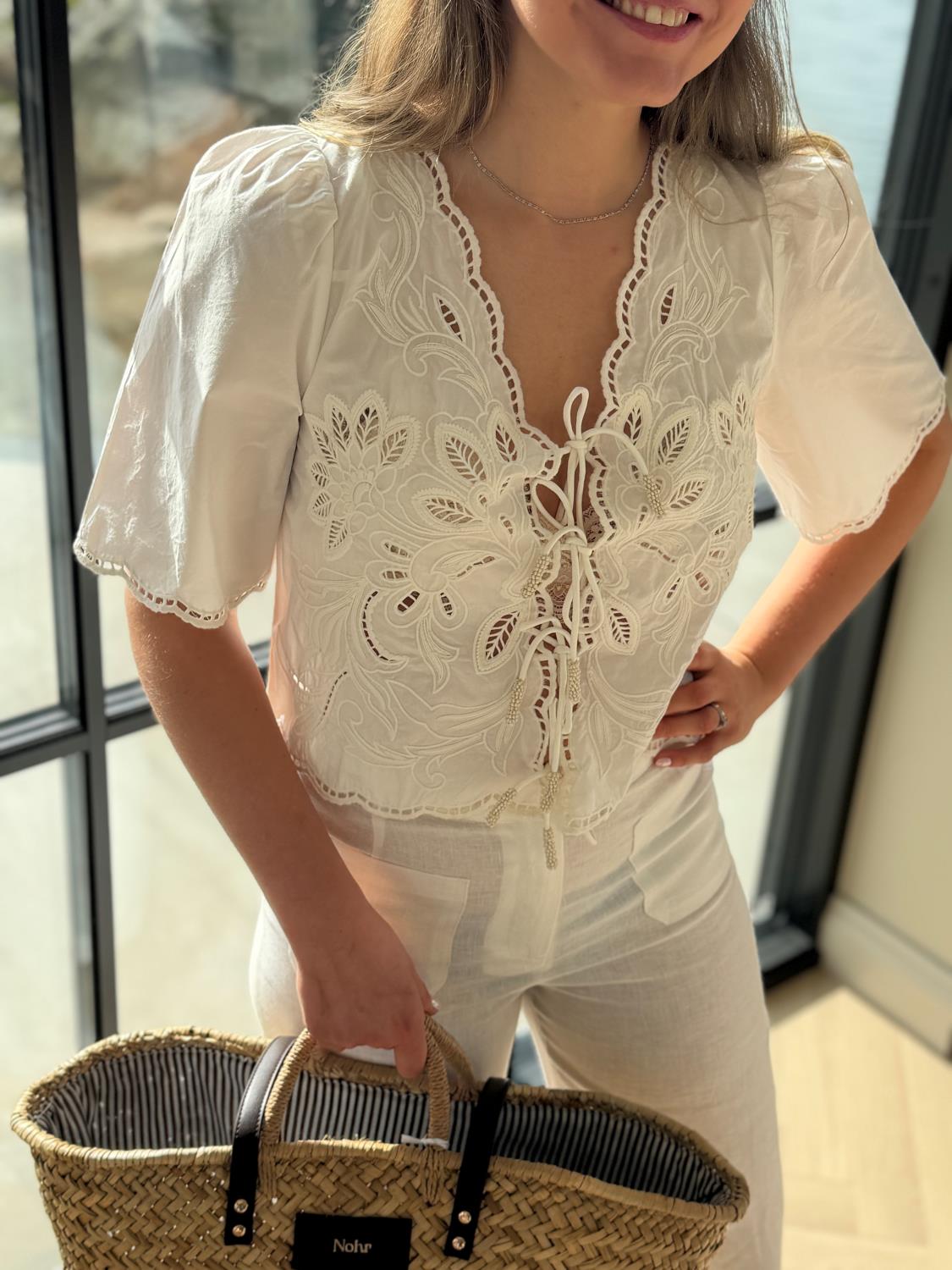 Lett, elegant og vakkert detaljert, gir Vinetta-toppen uanstrengt eleganse til hverdagsklær. Håndskåret broderi og kamskjellformede kanter skaper et særegent plagg forankret i håndverk.