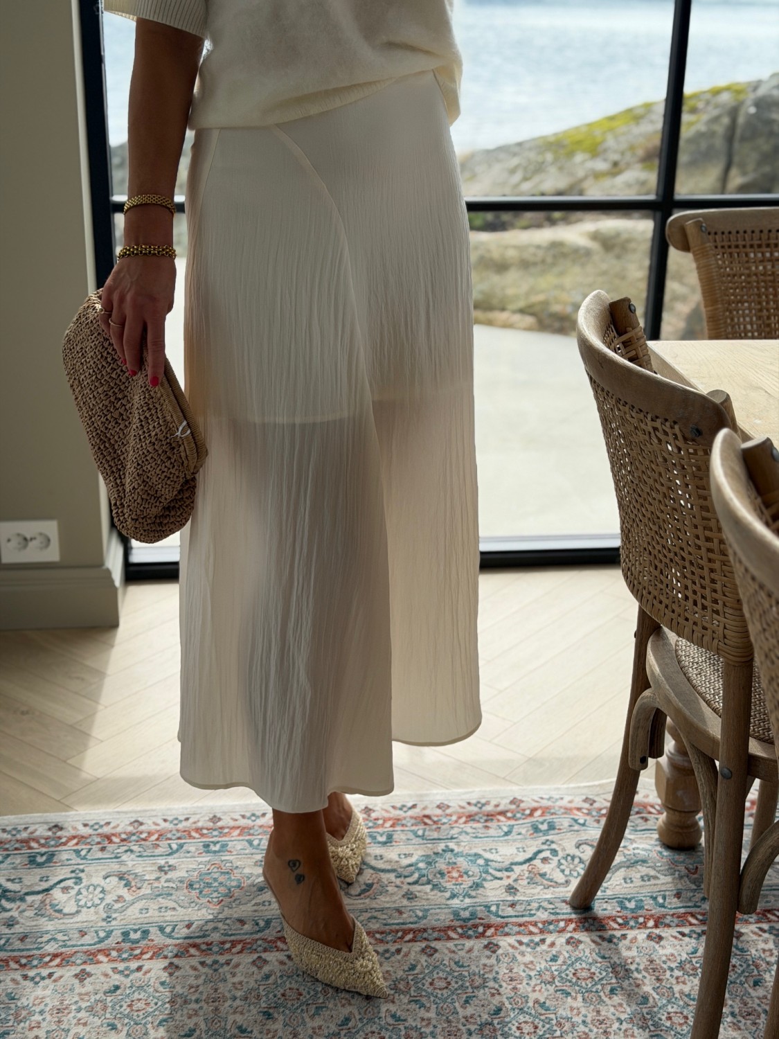 Skjørtet har en høy midje (high waist) som fremhever midjen på en flatterende måte. Det faller smalt over hoftene før det går over i en lett utsvingt fasong mot ankellengde, noe som gir et elegant og feminint uttrykk. Normal i størrelsen.