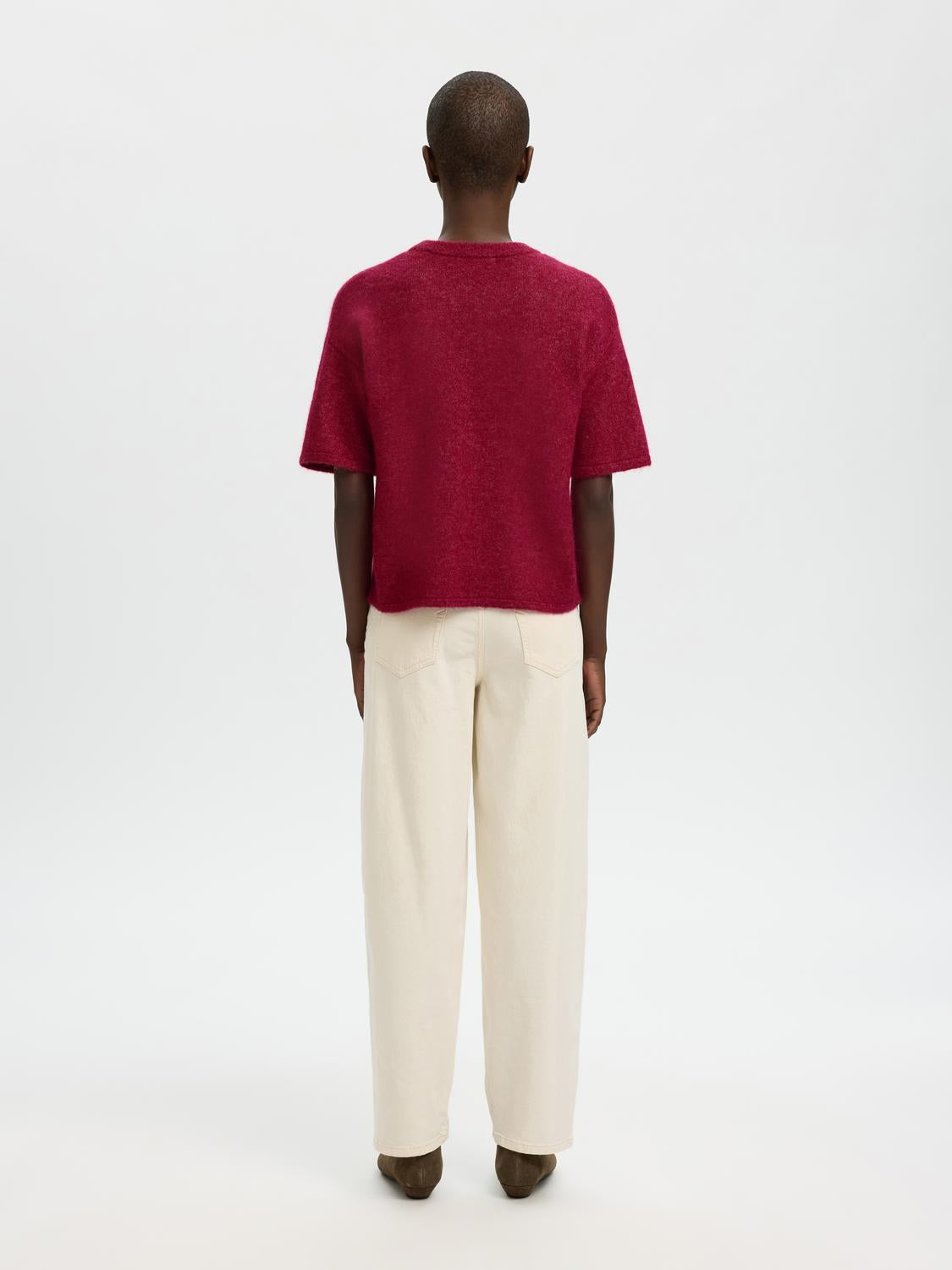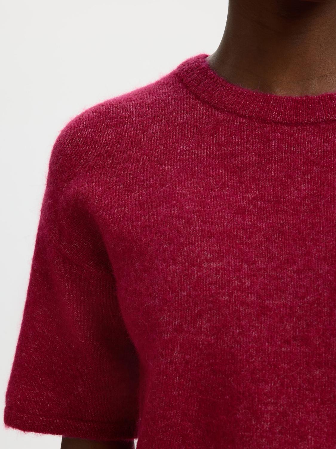 Lulu 2/4 Knit O-Neck Anemone fra Selected Femme er en strikket t-skjorte med rund hals. Dette plagget er ermeløst, men har brede ermer og ribbede mansjetter for en komfortabel og regular passform.