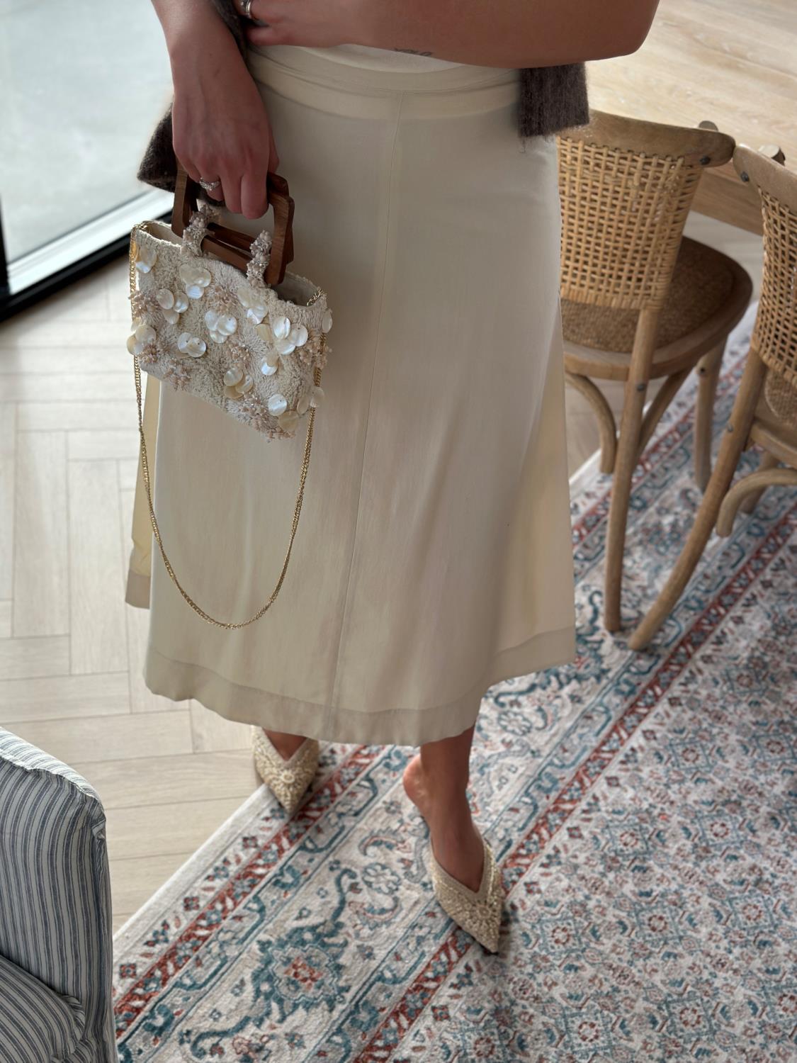 Henrietta er et legglangt, flagrende skjørt i 100 % spunnet silke. Det har en liten linning med glidelås i siden og diskrete sømdetaljer foran og bak. Et raffinert, elegant og tidløst plagg.