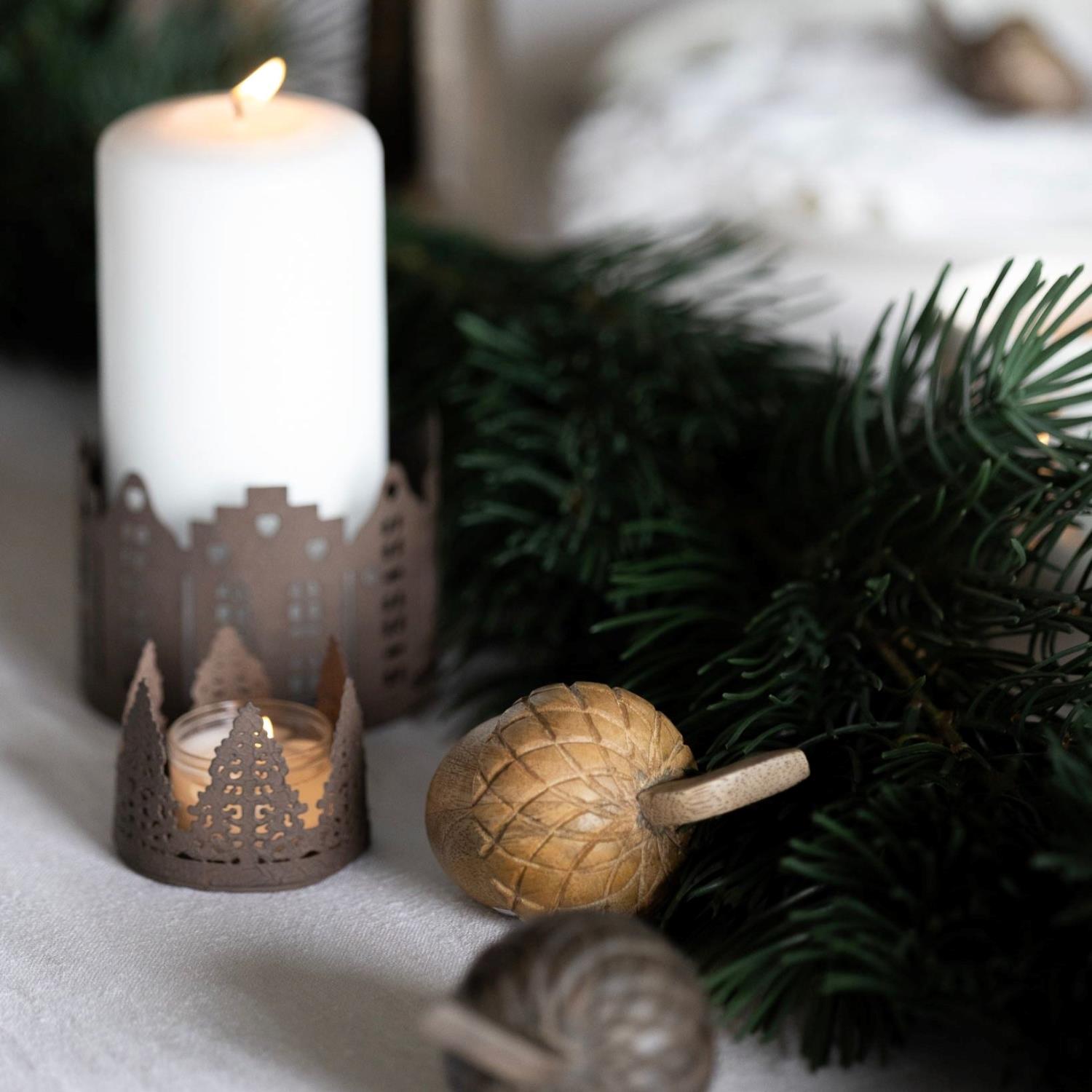 Lysholder i brunt metall til kubbelys med motiv av juleby.