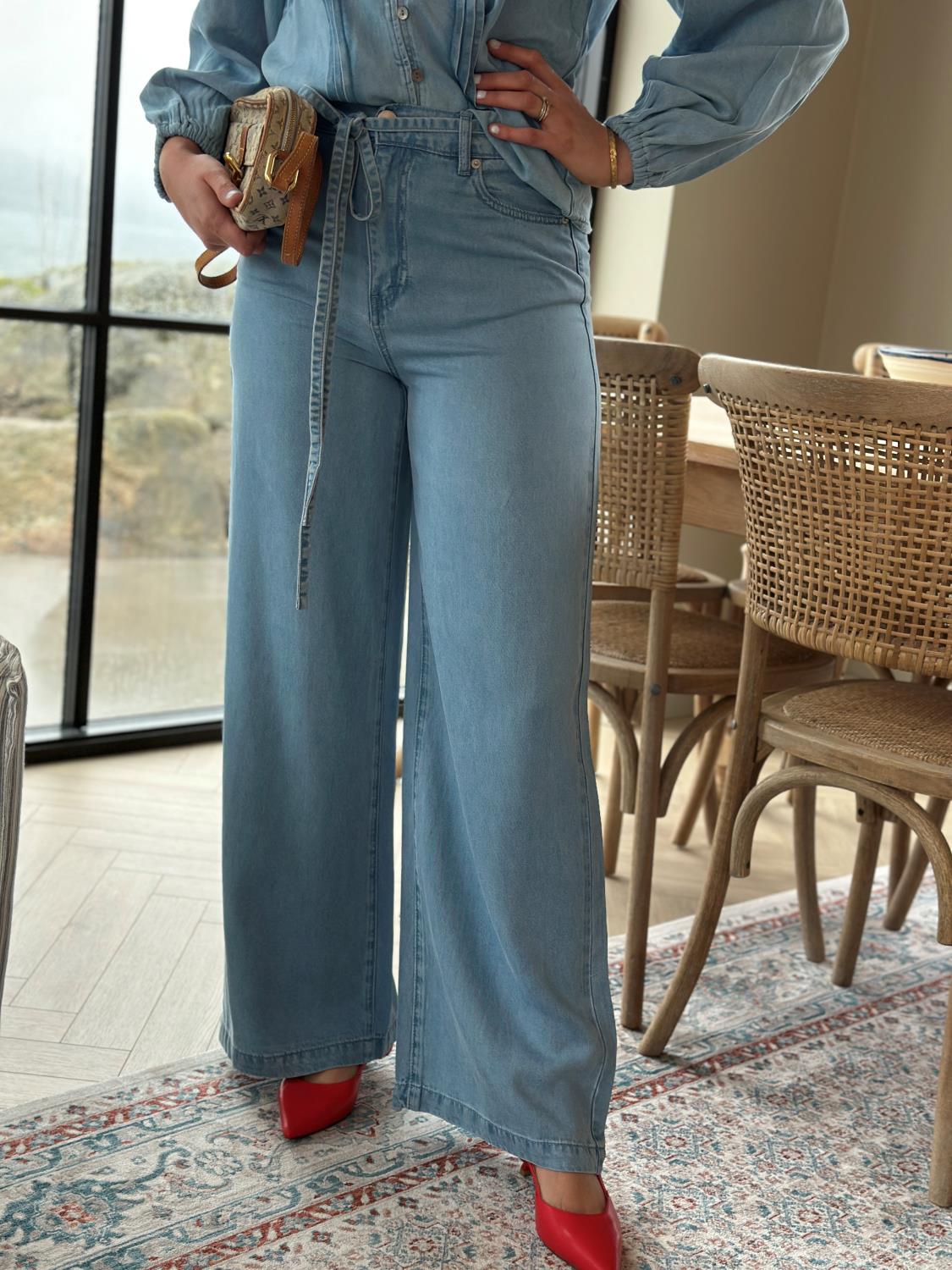 Bukser i lett og myk denim med elastikk og snøring i livet. Vide ben som gir en avslappet silhuett.