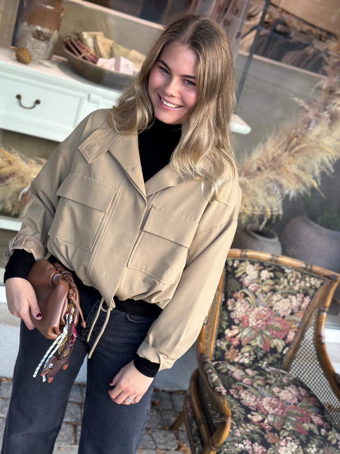 Jakke fra Suncoo Paris. Dona er en oversized kort jakke. Jakken har en løs passform, to store lommer med klaff og kneppe lukking foran. Nederst på jakken er det snorer som kan strammes. En tøff jakke til våren.