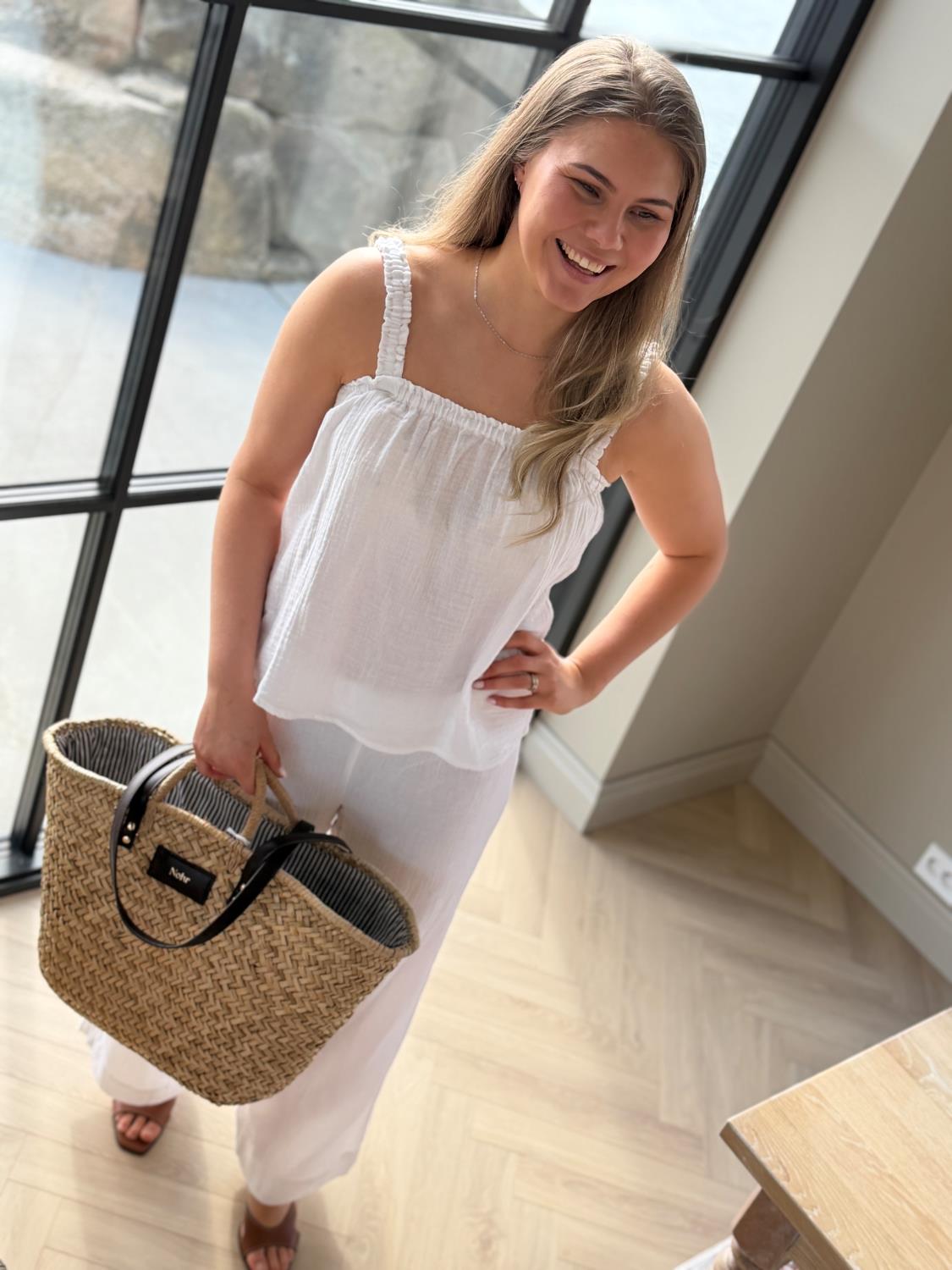Nera er en myk bomullsgaze-bukse designet for maksimal komfort og luftig bevegelse. Den avslappede, vide ben silhuetten føles lett på kroppen, noe som gjør den ideell for sommerdager og reiser.
