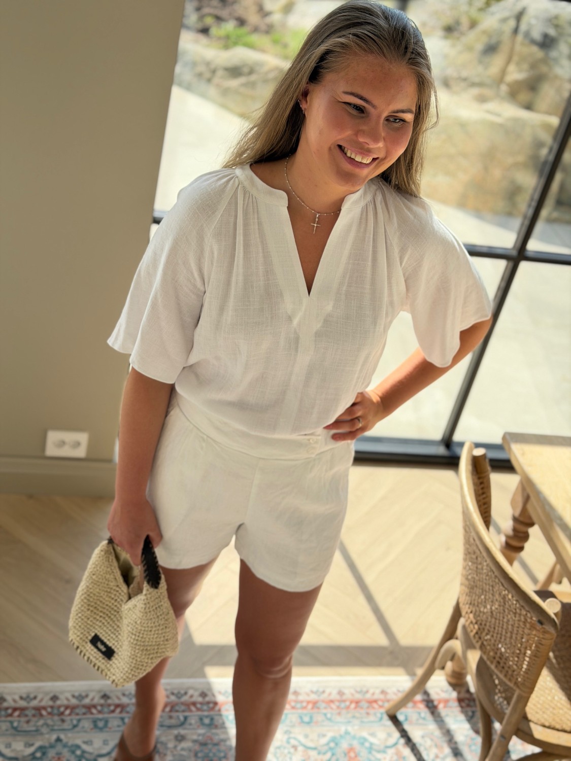 Shortsen er laget i lin med fôr, noe som gir en mer komfortabel og dekkende følelse samtidig som den beholder det luftige uttrykket. Den faller fint på kroppen og gir en naturlig, avslappet silhuett.