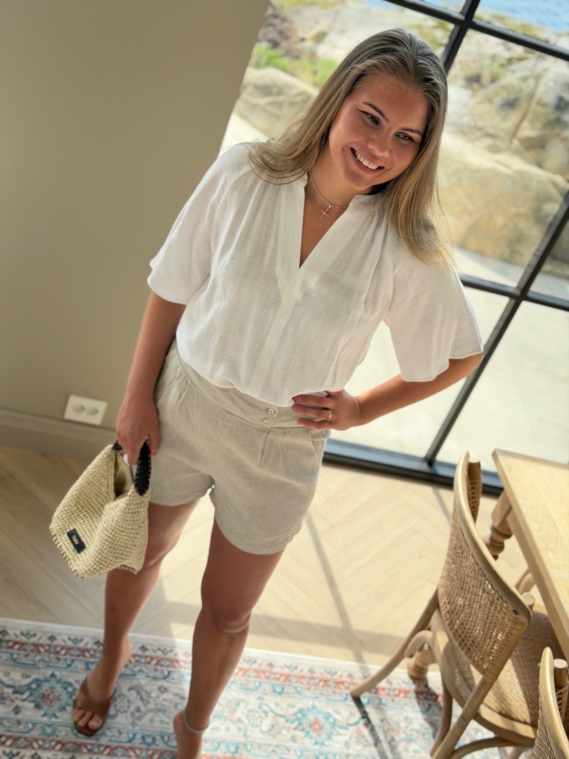 Shortsen er laget i lin med fôr, noe som gir en mer komfortabel og dekkende følelse samtidig som den beholder det luftige uttrykket. Den faller fint på kroppen og gir en naturlig, avslappet silhuett.