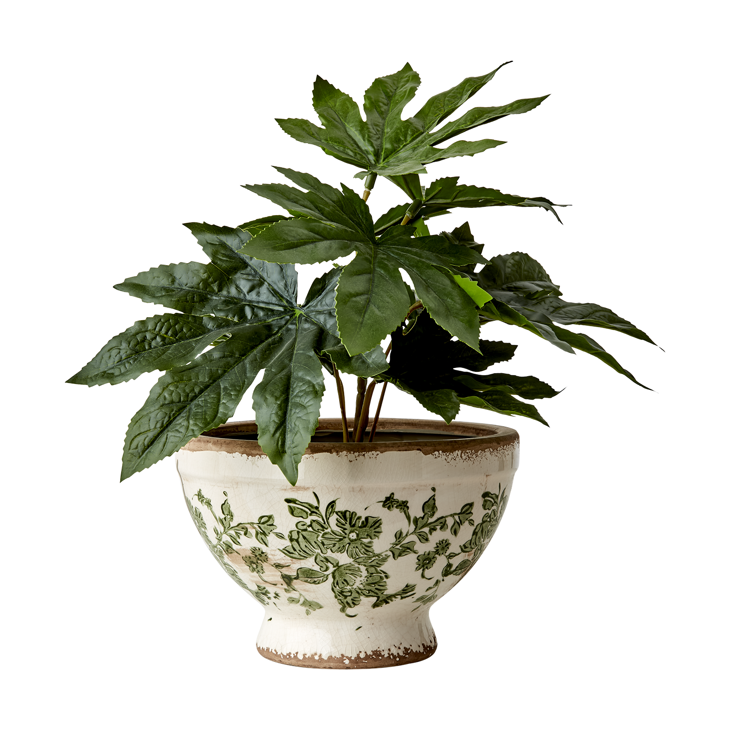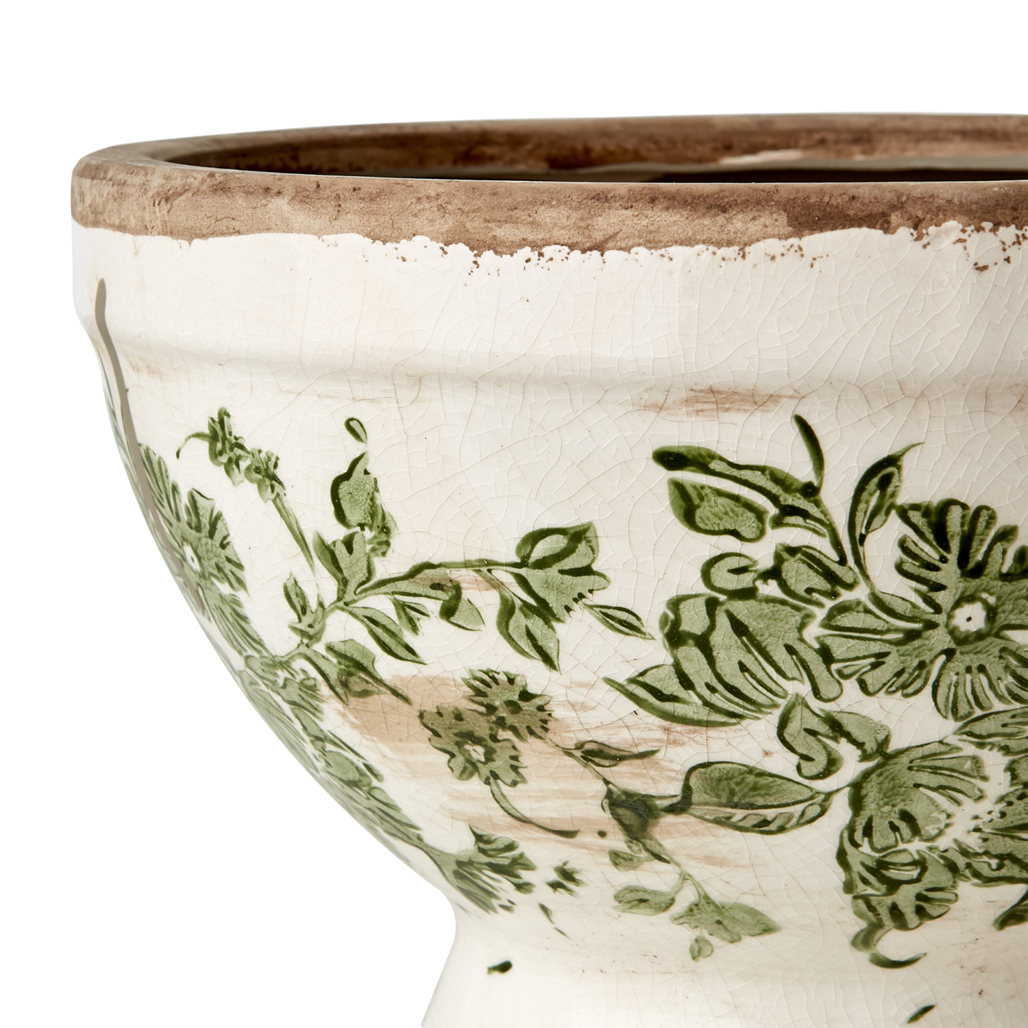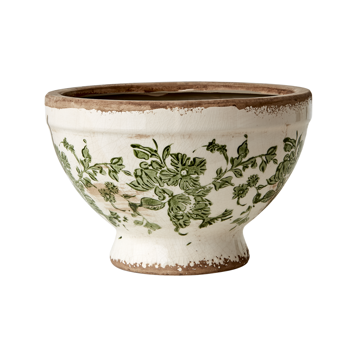 Victoria potte fra Affari med nostalgisk og rustikt uttryk. Den har hvit glasur med grønt blomstermotiv. Overflaten viser tydelige krakeleringer (små sprekker i glasuren), noe som gir den et antikt preg.