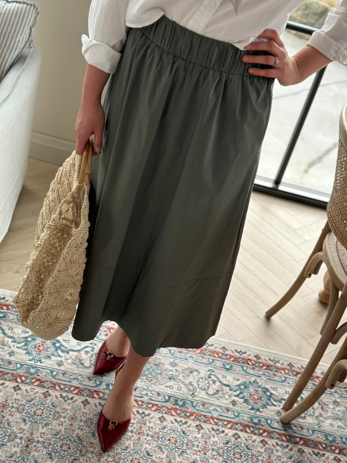 Midilengde skjørt i myk bomullspoplin, med en kul høy midje og lommer foran.