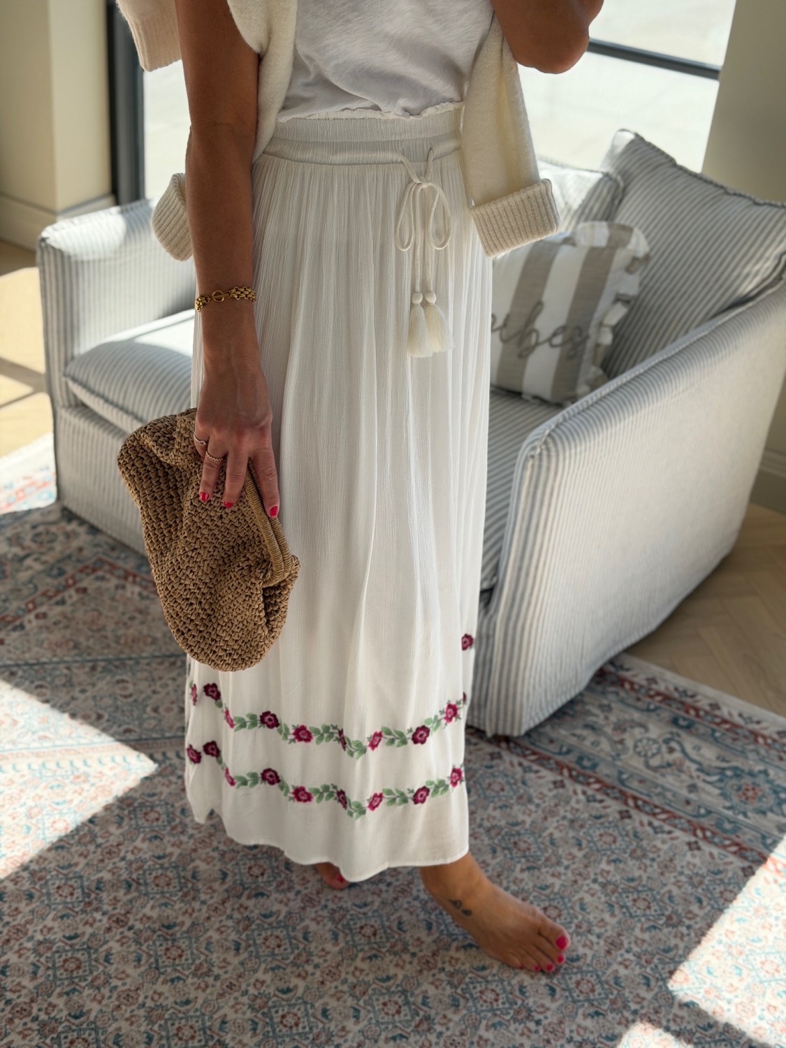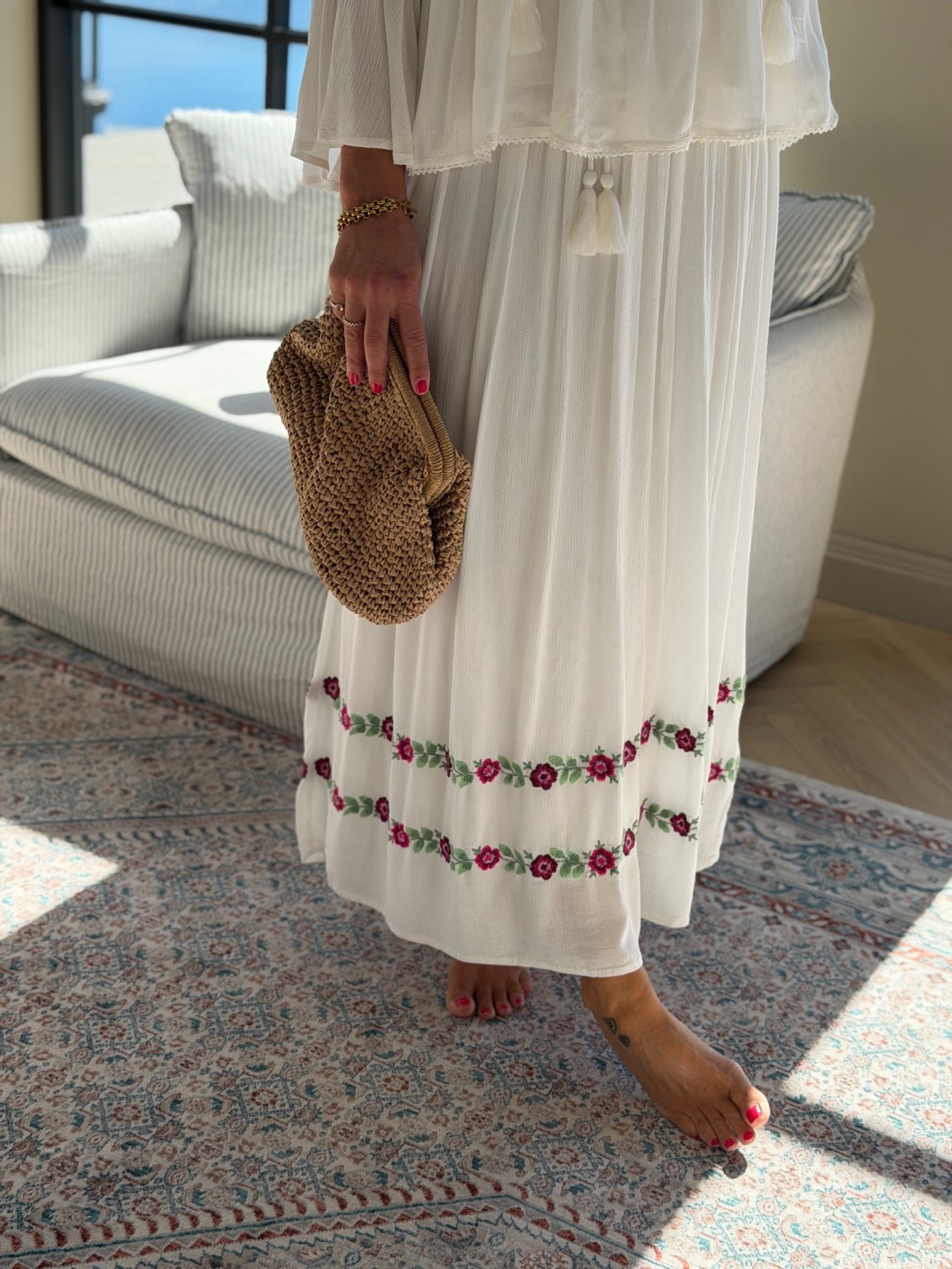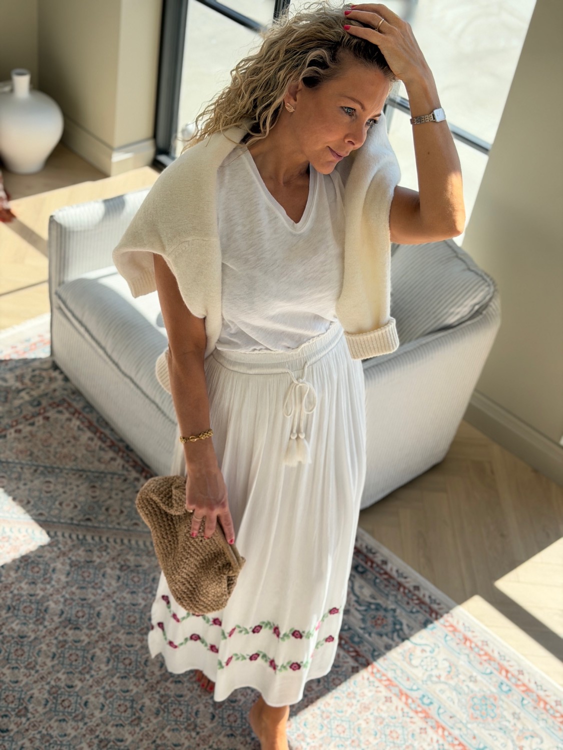 Skjørtet er designet som en del av et matchende sett sammen med Chella-toppen, som har vakre broderier i bærestykket. Sammen skaper de et komplett antrekk med en eksklusiv, bohemsk følelse – nesten som en kjole, men med mer fleksibilitet.
