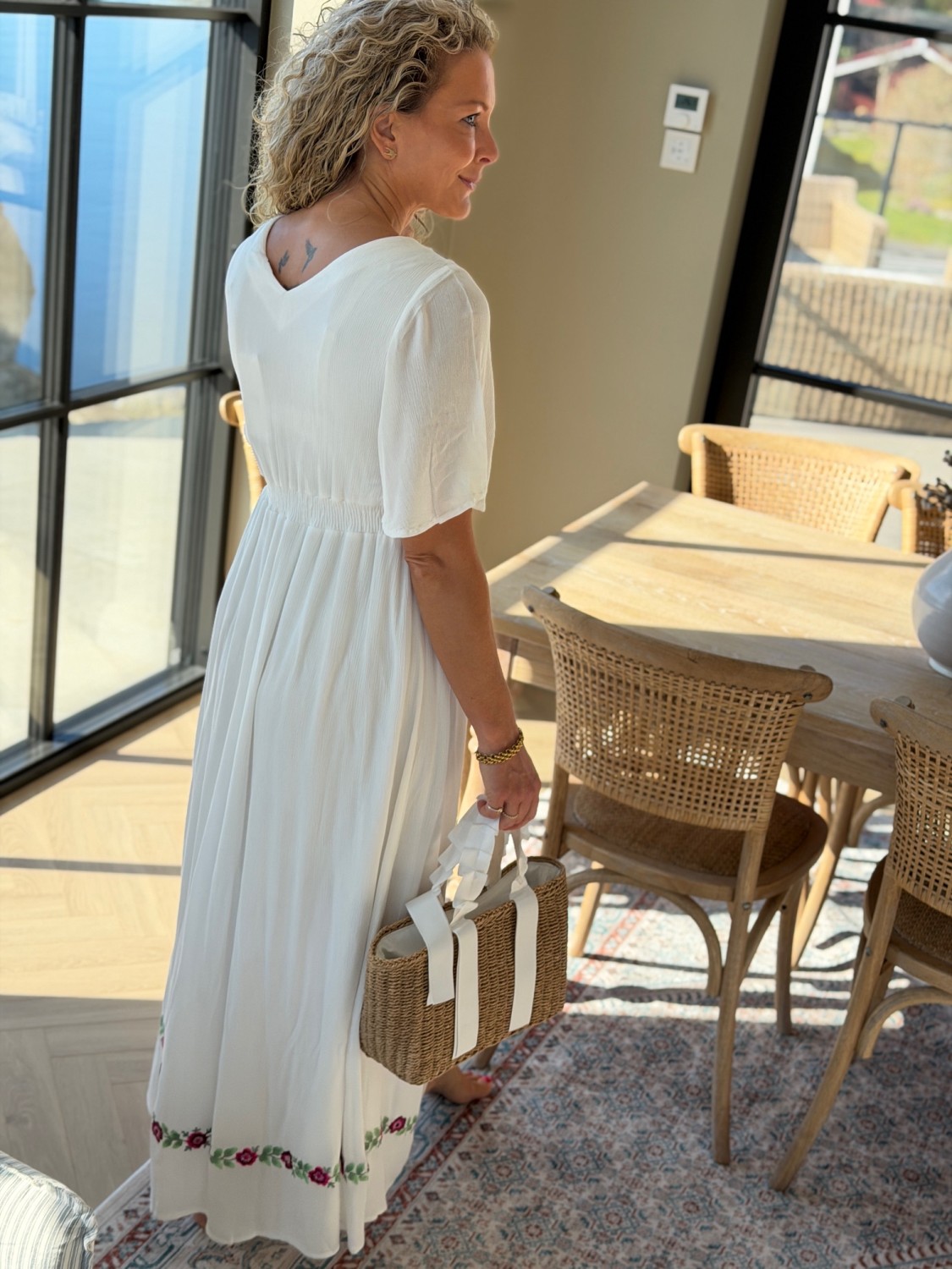 Kjolen er laget i 100% viskose som gir et mykt, lett og flytende fall. De vakre broderiene i bærestykket tilfører et håndverksinspirert preg og gir kjolen det lille ekstra. Sammen med den luftige fasongen skaper dette en gjennomført og feminin helhet .