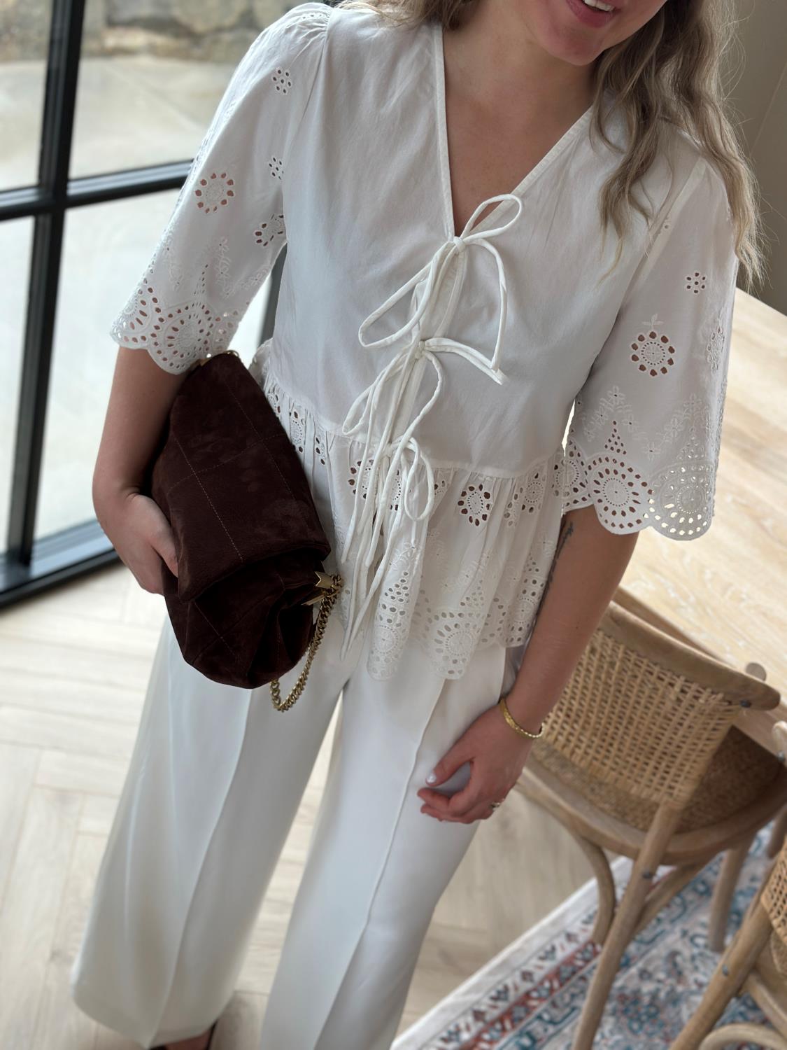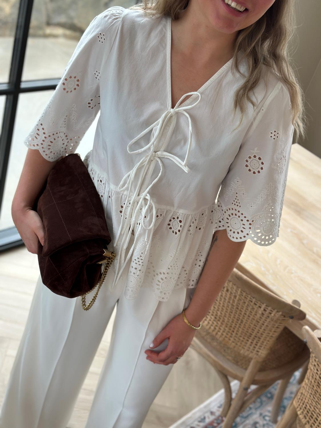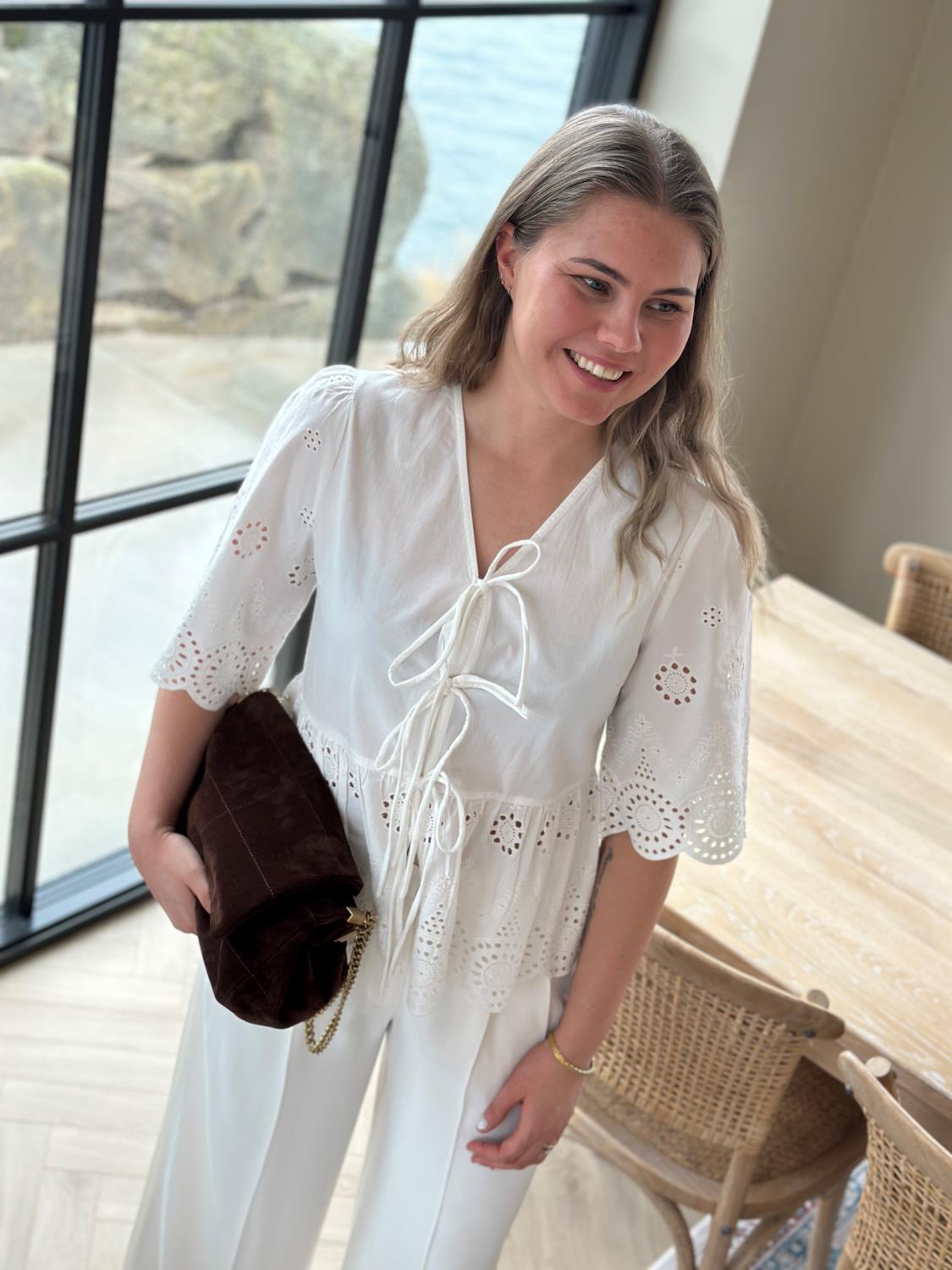 Yascornelia 2/4 Tie Top fra Y.A.S er en romantisk og luftig topp. Toppens dype V-hals knytes med tre bånd i front, mens 2/4-ermer med lett volum og en lett utsvinget, kort passform skaper en feminin silhuett og luftig bevegelse. Delikate hullbroderier i myk økologisk bomull og bølgekantede avslutninger gir et lekkert broderie anglaise-uttrykk. Det lette, delvis gjennomsiktige stoffet gjør den perfekt til varme dager – style den med høytlivsjeans, shorts eller skjørt for en uanstrengt sommerlook.