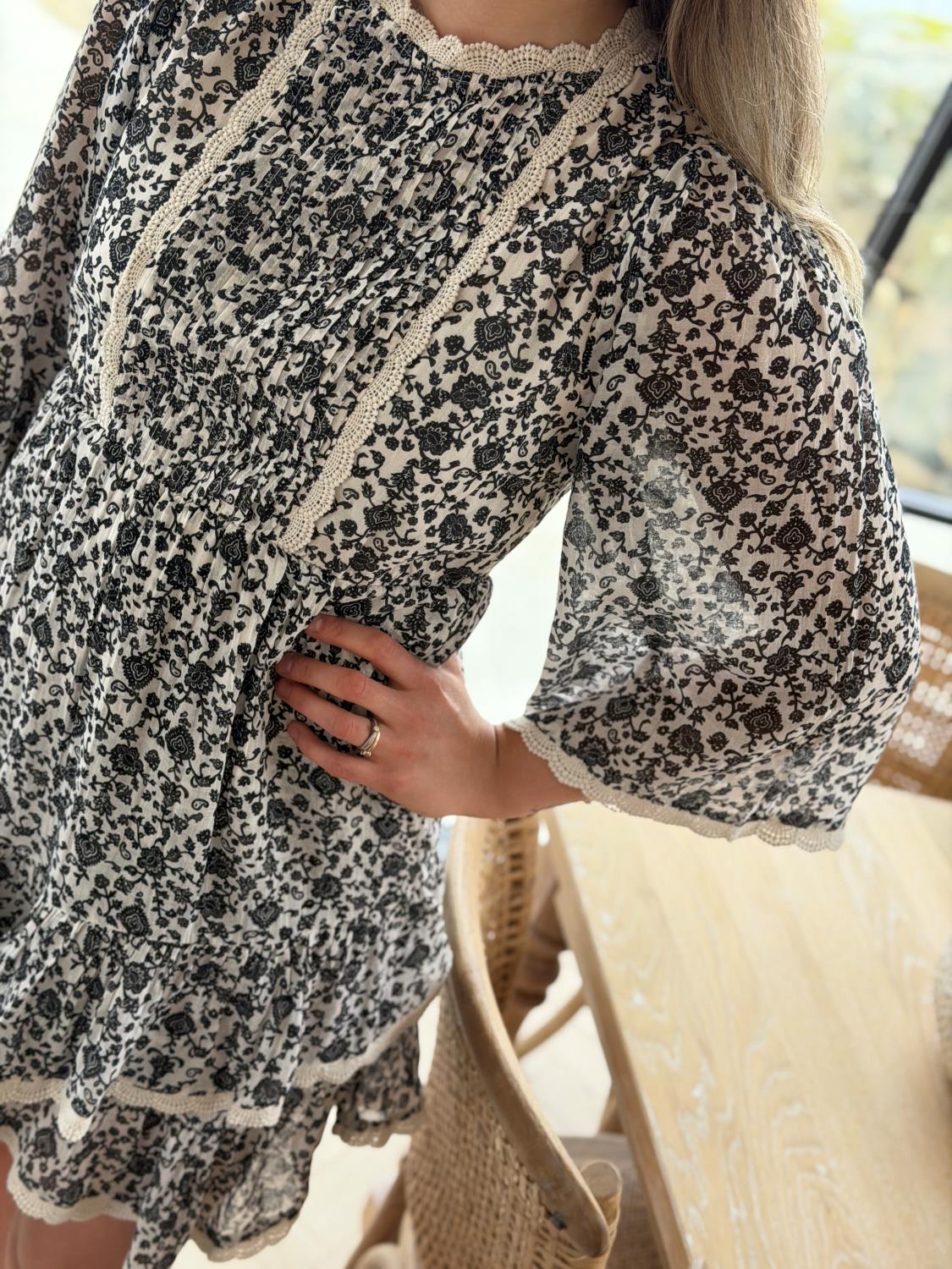 Delikat kjole fra YAS i sort og hvitt, med blondedetaljer. Kjolen har 3/4 ermer, elastisk midje og er laget i 100% bomull. Super behagelelig kjole, men nydelige ermer som er vide med blondedetaljer.