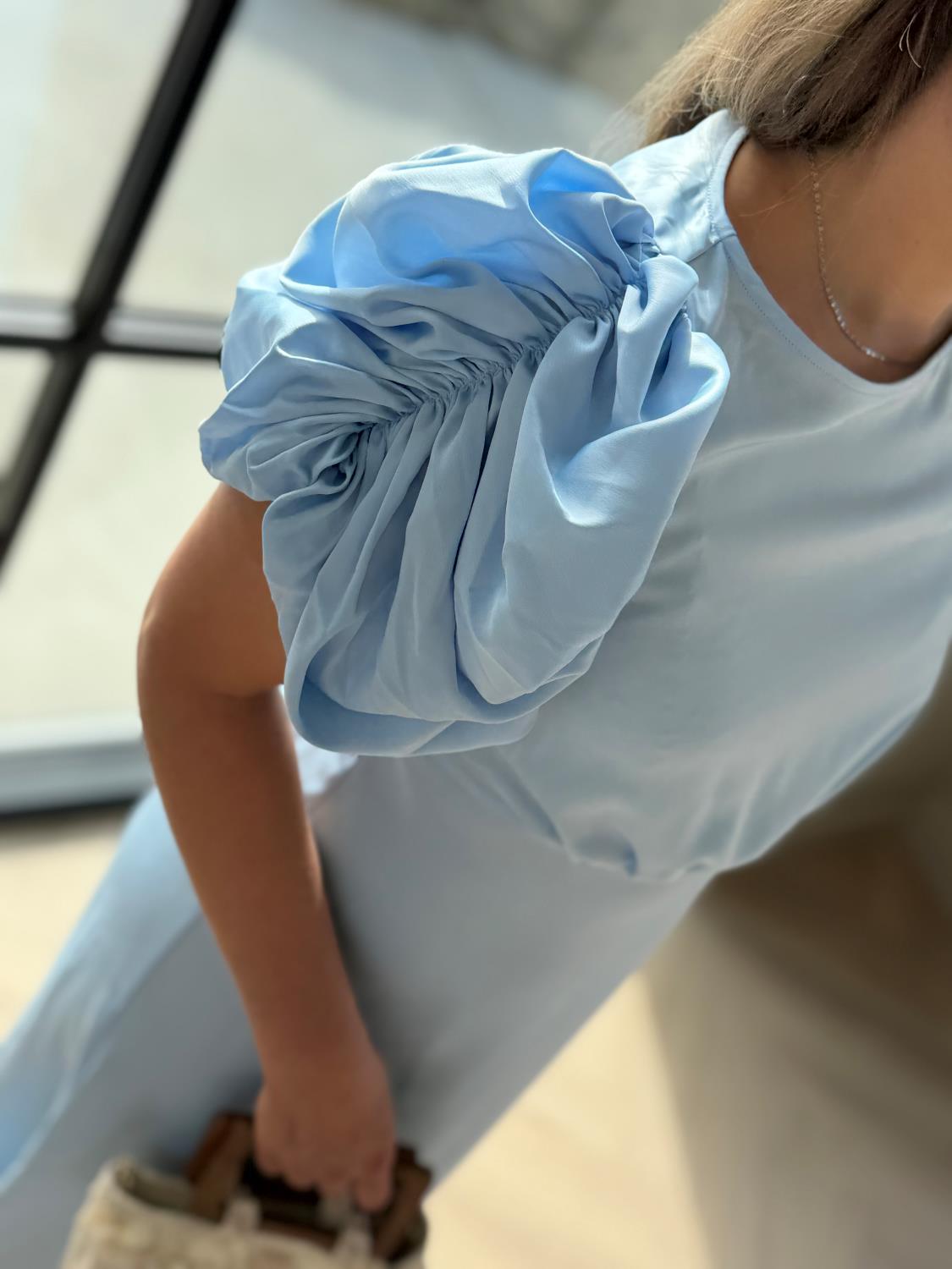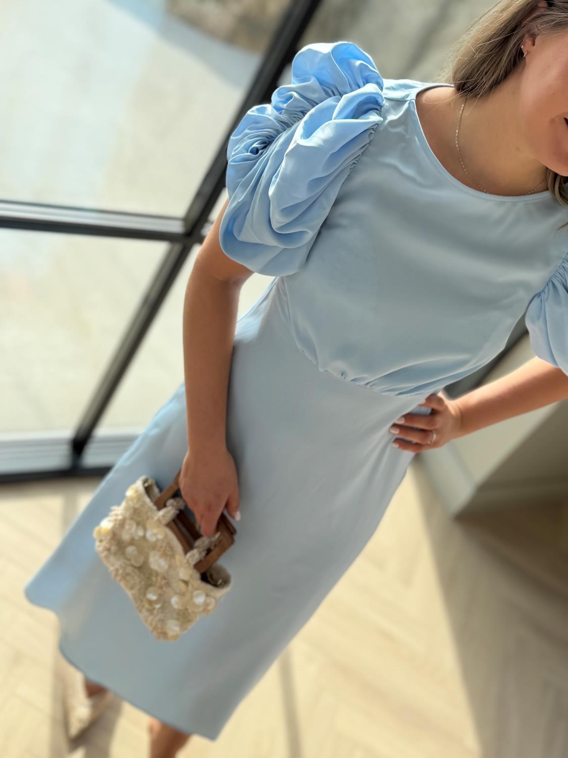 En elegant kjole i en myk lyseblå nyanse som kombinerer moderne femininitet med et tidløst uttrykk. Den rene, minimalistiske fasongen balanseres av markerte puffermer som gir antrekket karakter og et sofistikert preg. Den høye midjen fremhever silhuetten på en flatterende måte, mens det lett utsvingte skjørtet faller mykt og skaper en feminin bevegelse.