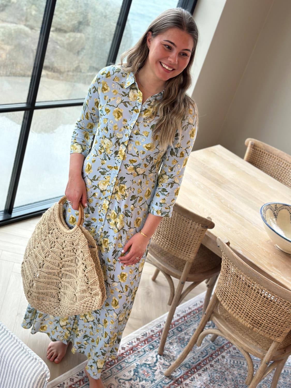 Savanna er en skjortekjole fra YAS med knappelukking og 7/8 ermer. Kjolen ha rmarkert midje og løst skjørt.